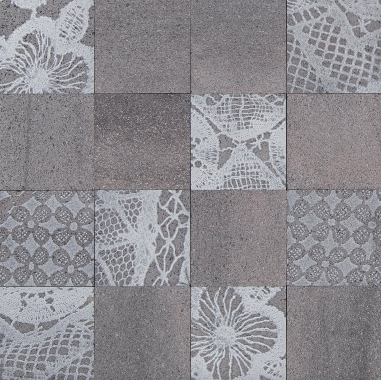 Odolný materiál od Nero Sicilia s vzhledem tradičních krajek a tkanin, které jsou položeny na lávový kámen sítotiskem a vytvářejí dvě jedinečné a hmatové série, iRicami a iTessuti.
