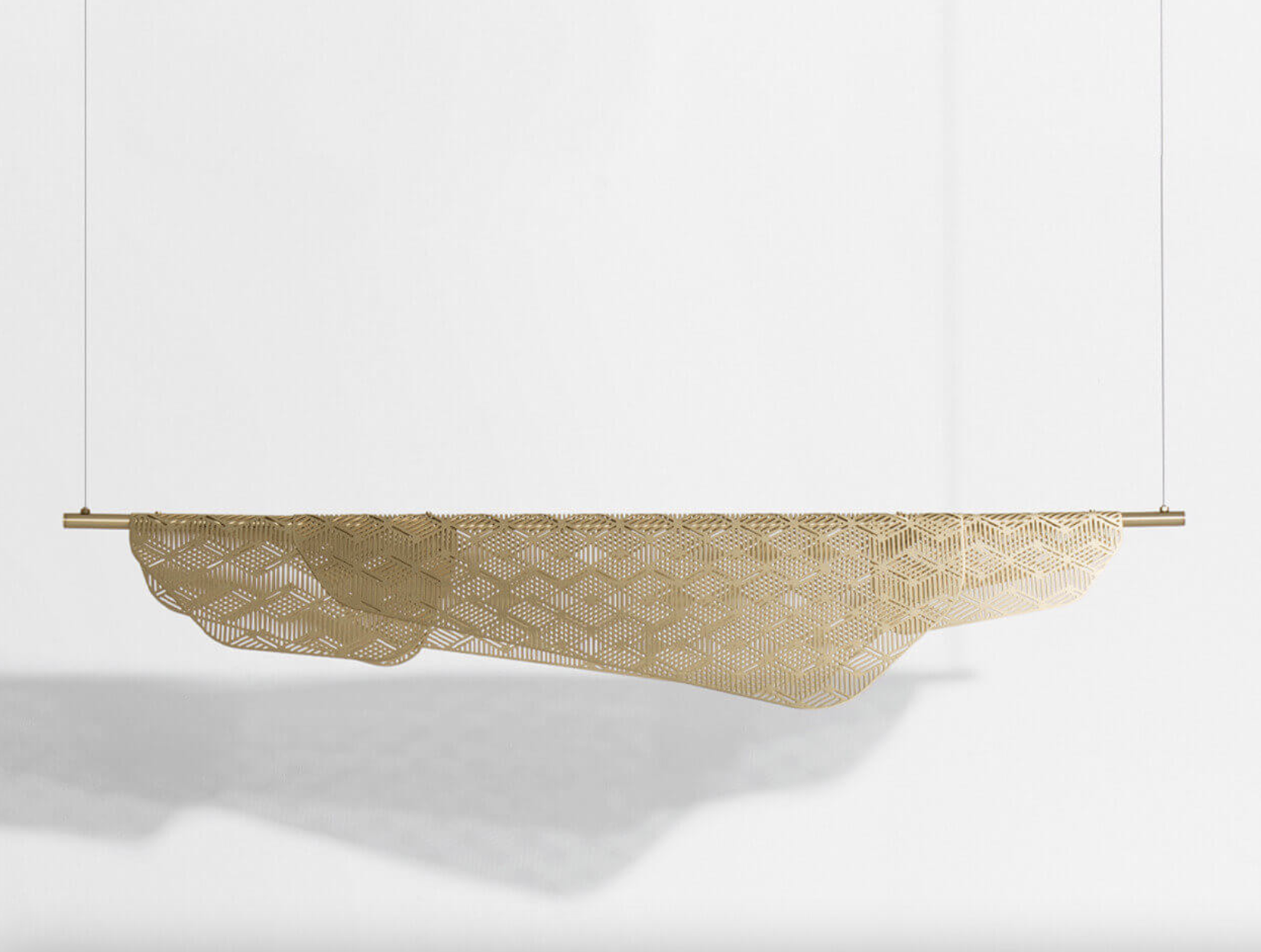 Mosazné závěsné svítidlo inspirováno beztíží „prádla vlnícího se na středomořských balkonech“. Noé Duchaufour-Lawrance navrhuje MÉDITERRANÉA, sérii světel z kartáčované mosazi s LED světlem. Kovová tkanina spočívá na světelné struktuře, tvaruje a rozptyluje světlo živým a geometrickým vzorem.