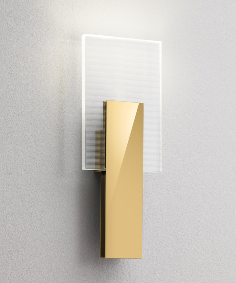 Nástěnná lampa AMULETTE F56 má difuzor vyrobený z žebrovaného skla se saténovými okraji s pozinkovaným kovovým rámečkem v lesklé zlaté nebo černé barvě.