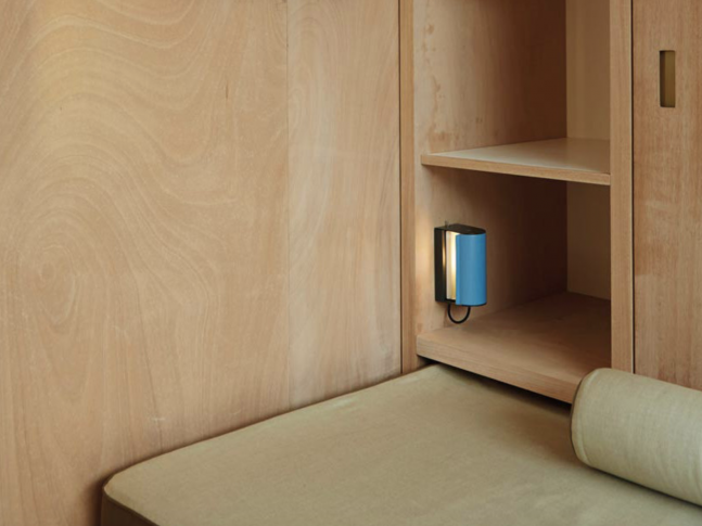 Nástěnná LED lampa s válcovým stínidlem k dispozici ve dvou velikostech a ve světle modrém lakovaném kovu.