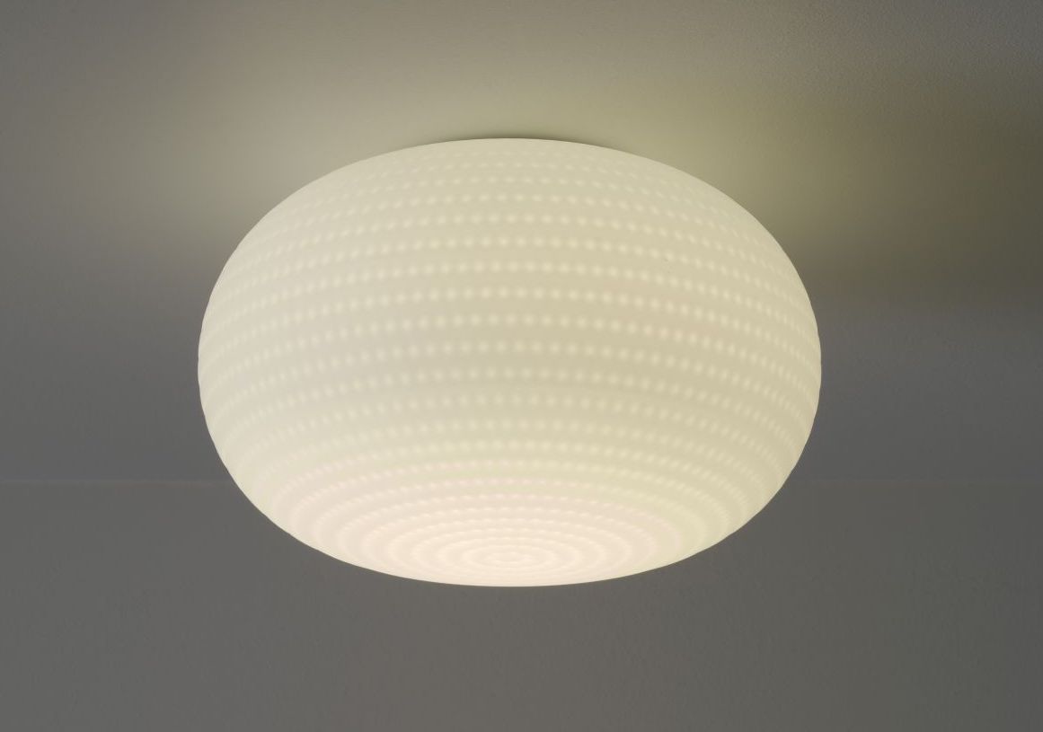 Nástěnná lampa Bainca je vybavena difuzérem ze skleněného foukaného skla s mléčně bílým saténovým povrchem. Povrch difuzéru je posetý jemnými drážkami, což přináší fefekt čerstvých stop ve sněhu. Je dotupná v několika různých velikostech.