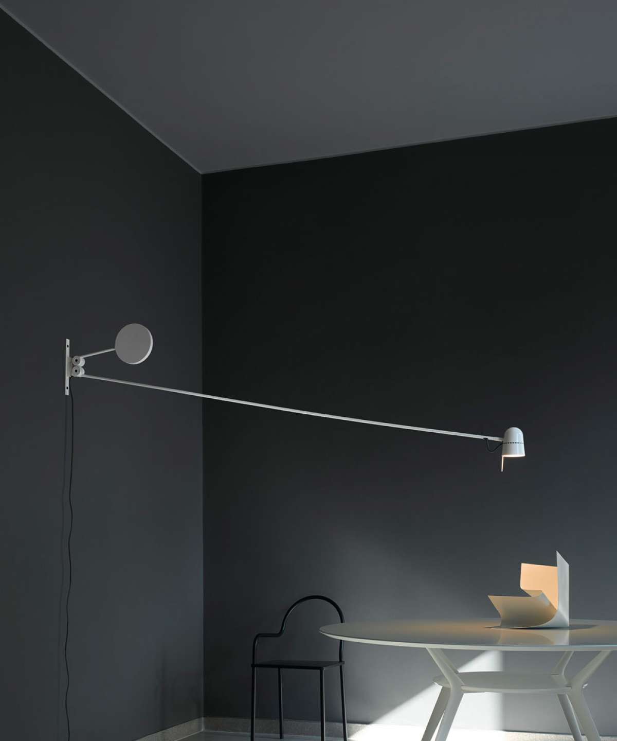 Objekt, který vypadá, že vzdoruje zákonům fyziky. Umístěný podle potřeby v prostoru, LED osvětlení s variabilní instalací, naznačuje dynamickou rovnováhu sochařského díla. Světlo je vyrobeno z matné černé nebo bílé oceli s hliníkovým krytem.