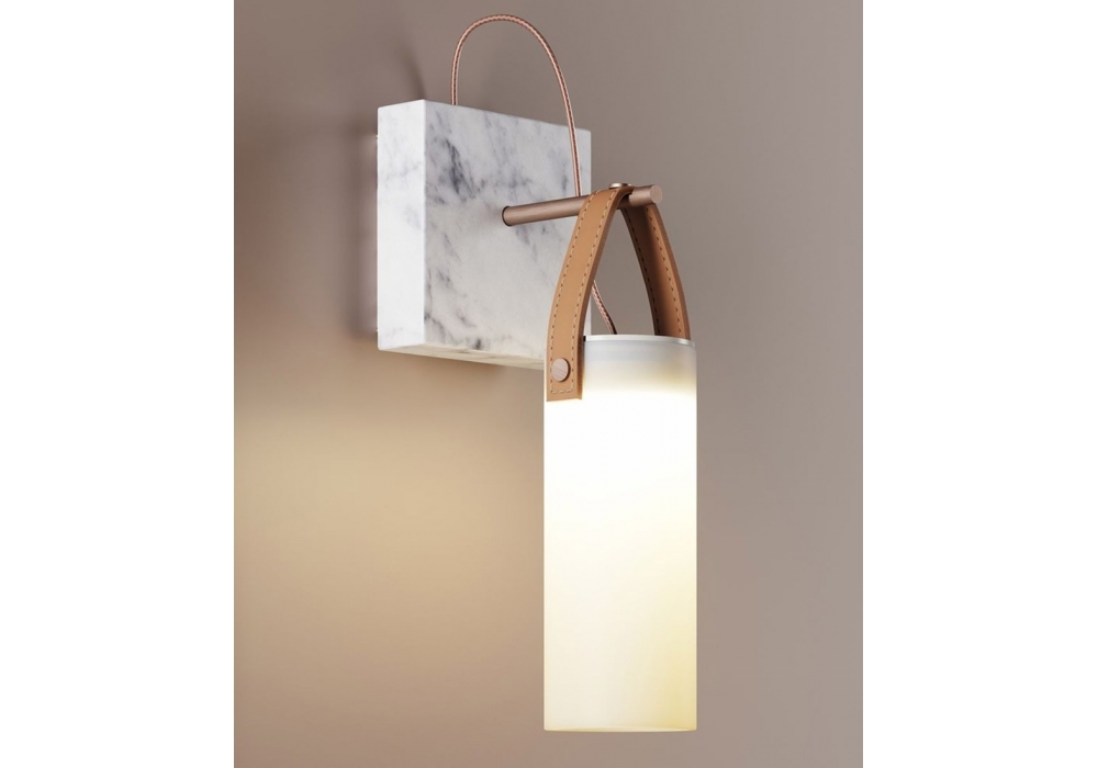 Nástěnná lampa inspirovaná antickými lampami. Stěžejními materiály jsou sklo, kůže, kov a mramor.
