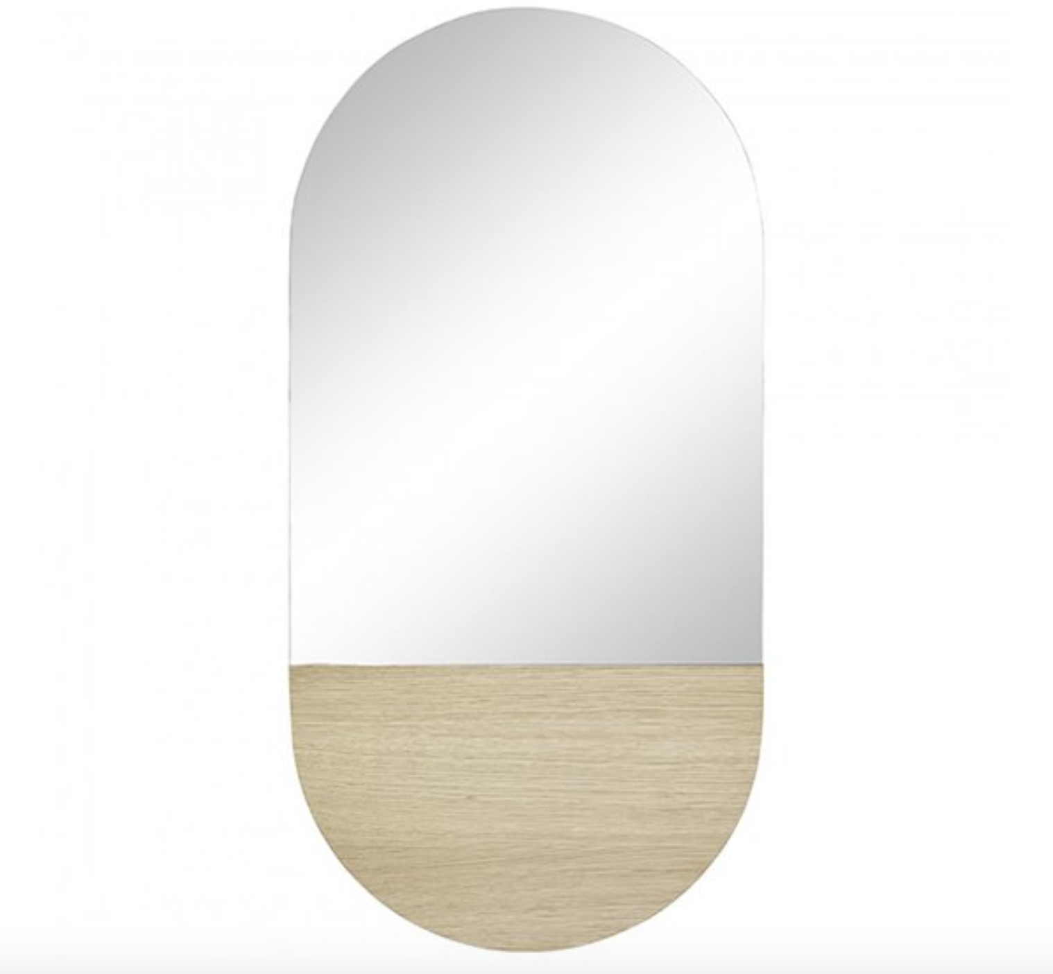 Nástěnné oválné zrcadlo Wall Mirror představuje elegantní vzhled. Je vyrobeno z čirého skla, které v jedné třetině nahrazuje masivní dubové dřevo. Zrcadlo je bez rámu a je nutné jej uchytit na stěnu.