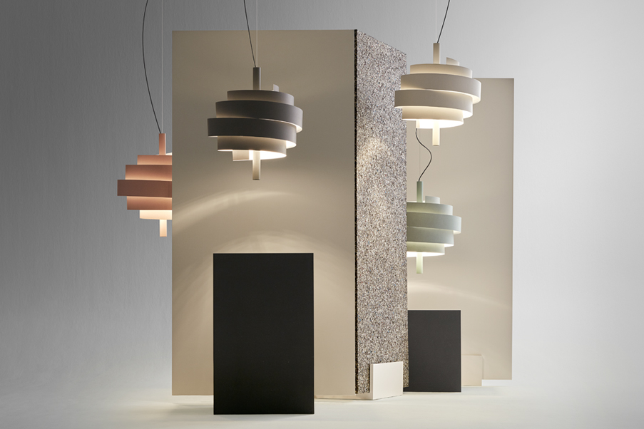 Inspirací pro nový závěsný lustr Piola je stuha zatočená do nekonečné spirály. Centrální hliníkový sloupek je obmotaný 5 metrovou stuhou. Piola plynule a ladně balancuje mezi rozptýleným světlem a stínem. V jednom svítidle tak koexistuje několik druhů světla – přímé světlo nasměrované dolů, nepřímé odražené světlo a paprsky prostupující skrze spirálu. Vyrábí Marset.