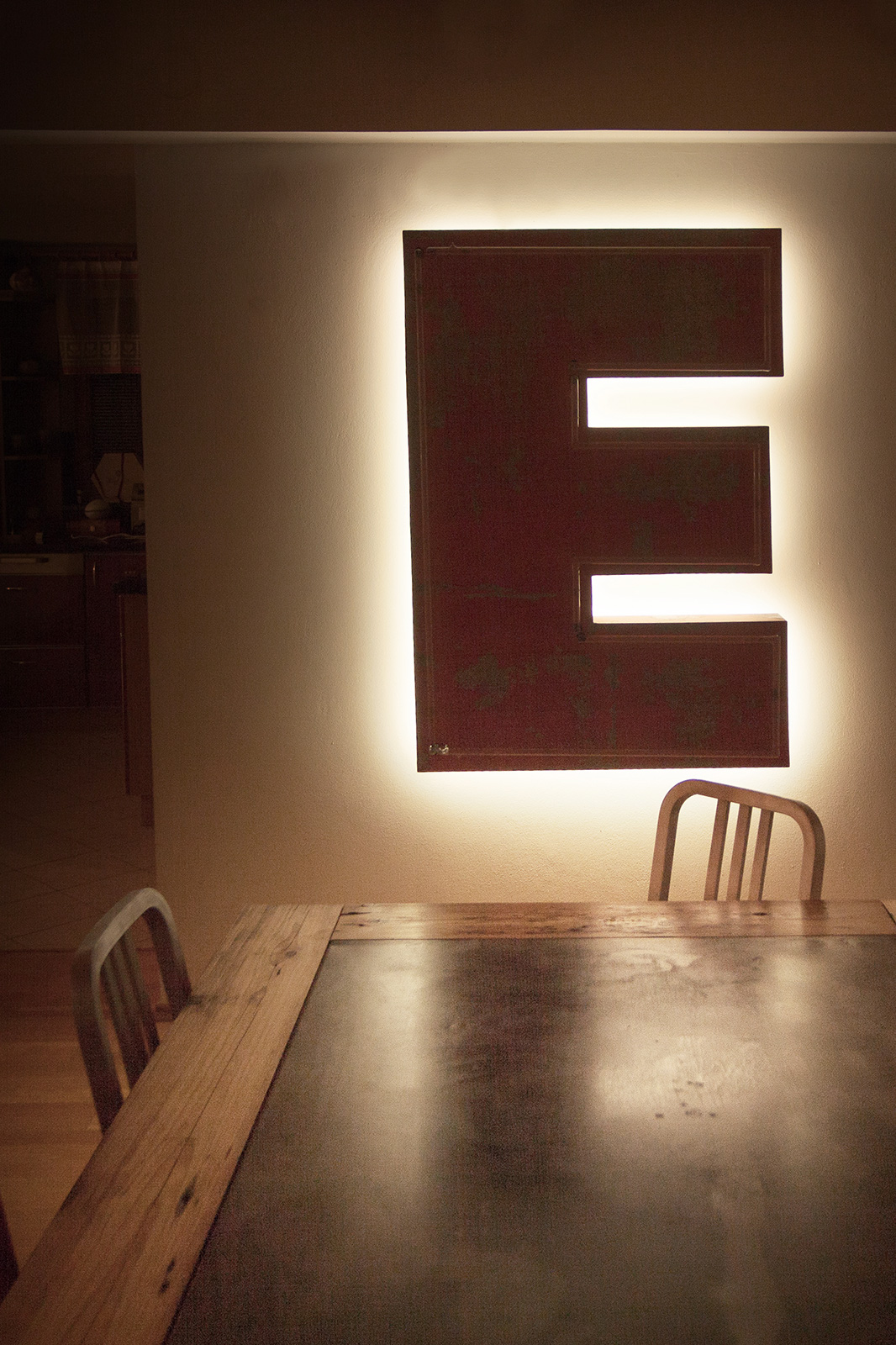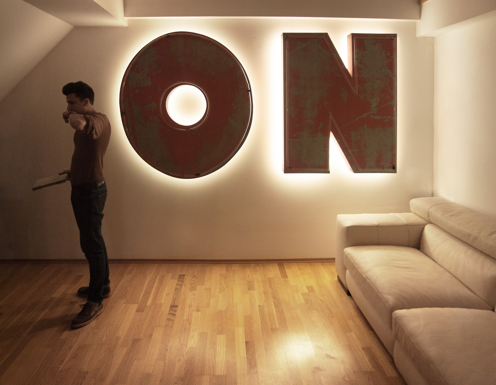 Znovuoživení starého neonového poutače. Podsvíceno pomocí LED. Doplněno o dálkové ovládání (dub/hliník).