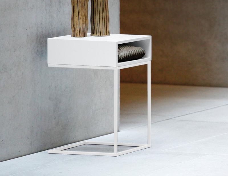 Noční stolek Dina můžete použít jako elegantní odkládací stolek. Konstrukce je z bíle lakované oceli a desku tvoří dýhované dřevo nebo bíla lakovaná dýha.