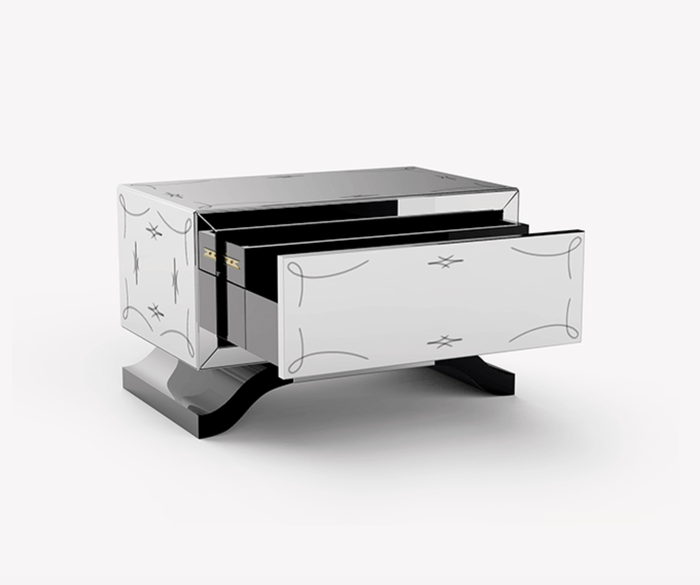 Metropolitan noční stolek je ovlivněn elegantním městským přístupem. Jeho jednoduché a čisté linie zvýrazňují ručně vyřezávané zrcadlové detaily a dodávají každé ložnici klasický nádech.