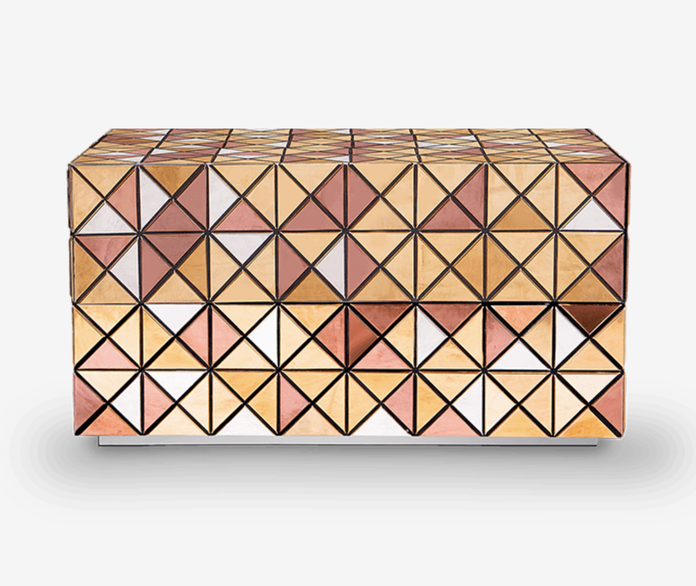 Noční stolek Pixel, vyrobený z malých trojúhelníků, si hraje s vnímáním a kombinuje výjimečné materiály s různobarevnými kompozicemi, aby kabinet získal jedinečný a nápadný design: ručně vyráběné zlacené trojúhelníky, několik různých druhů dřevěných listů od palisandru až po dýhu afrického ořechu.
