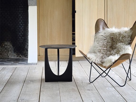 Odkládací stolek Geometric Side Table představuje souhru geometrických tvarů. Celodřevěný stolek je vyroben z masivního dubového dřeva s černým barveným dokončením. Kulatý top s nevšedním trojrozměrným podnožím vytváří zajímavý objekt vhodný např. ke křeslu nebo jako noční stolek.
