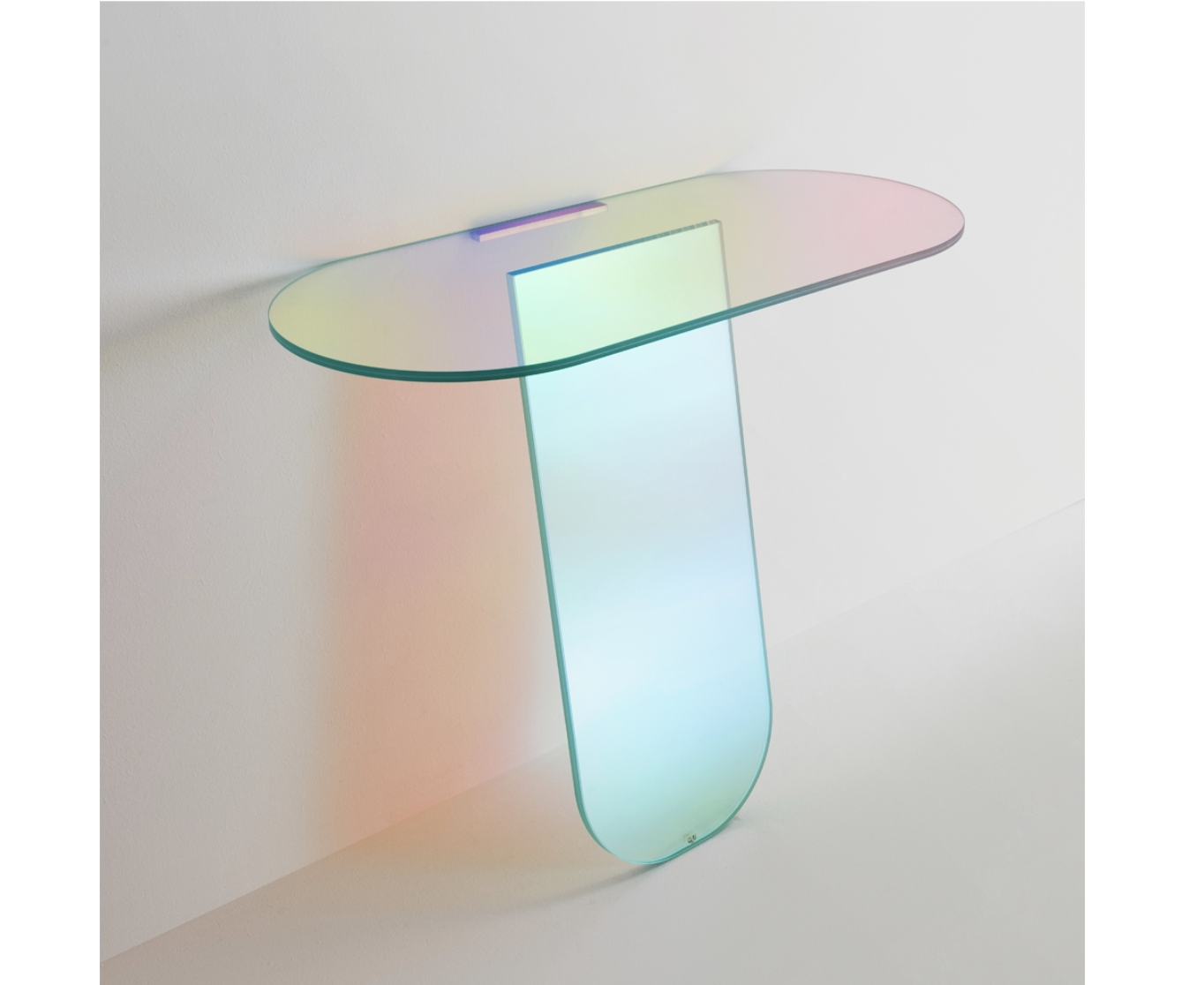 Jídelní stoly, odkládací stolky, konzole a zrcadla z vrstveného a lepeného skla, které se vyznačují speciální duhovou multichromatickou úpravou. Barevnost se mění v závislosti na úhlu světla a na úhlu pohledu. To je kolekce Shimmer op Glas Italia.