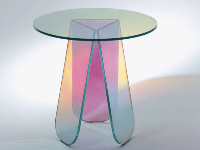 Jídelní stoly, odkládací stolky, konzole a zrcadla z vrstveného a lepeného skla, které se vyznačují speciální duhovou multichromatickou úpravou. Barevnost se mění v závislosti na úhlu světla a na úhlu pohledu. To je kolekce Shimmer op Glas Italia.