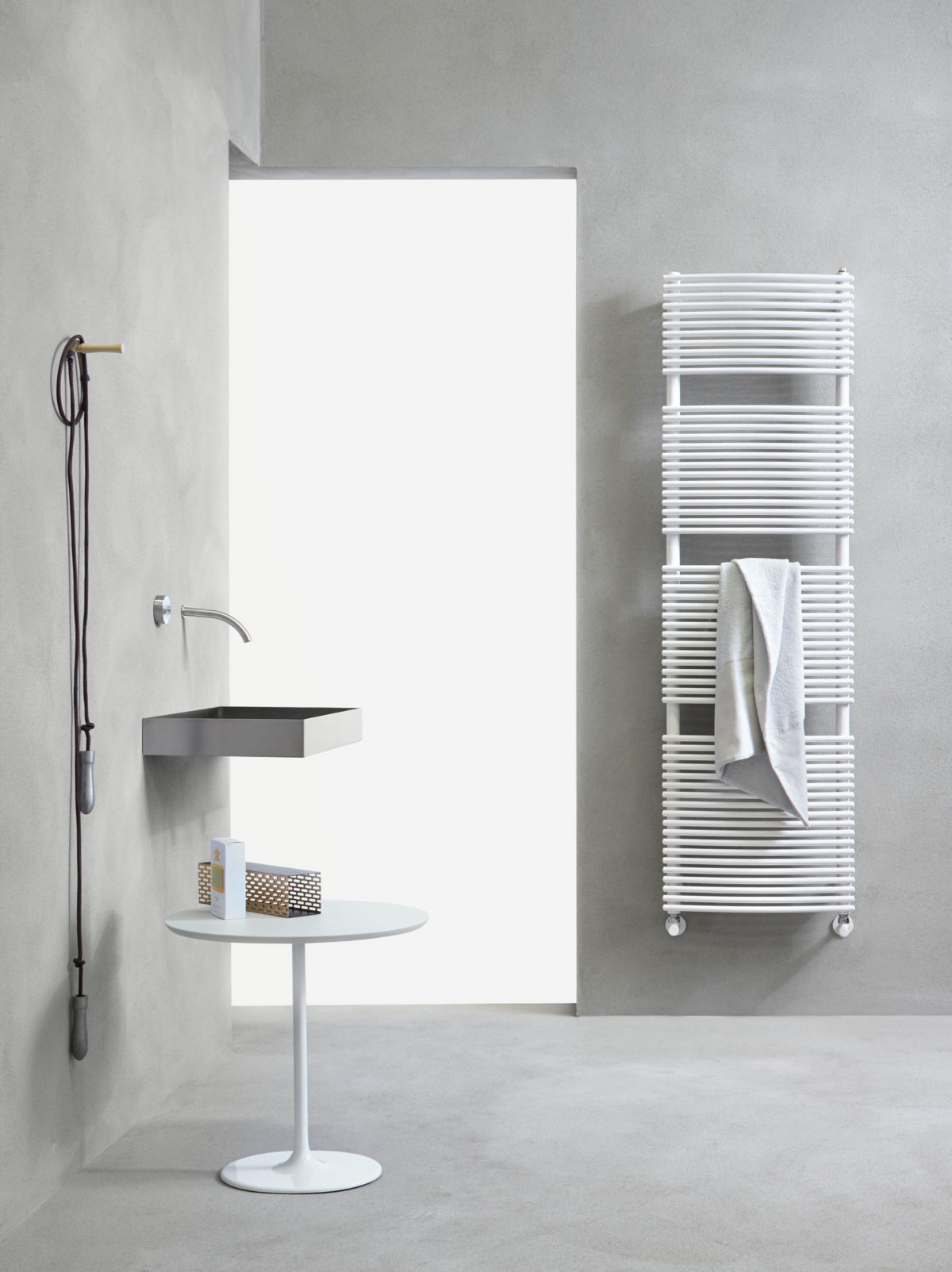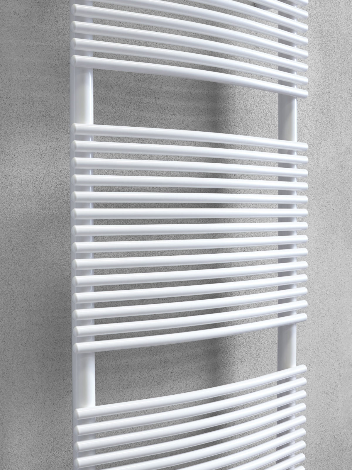 Ocelový ohřívač ručníků, vyrobený ze svislých kulatých trubek o průměru 35 mm a vodorovně zaoblených, zakřivených trubek o průměru 16 mm.