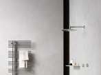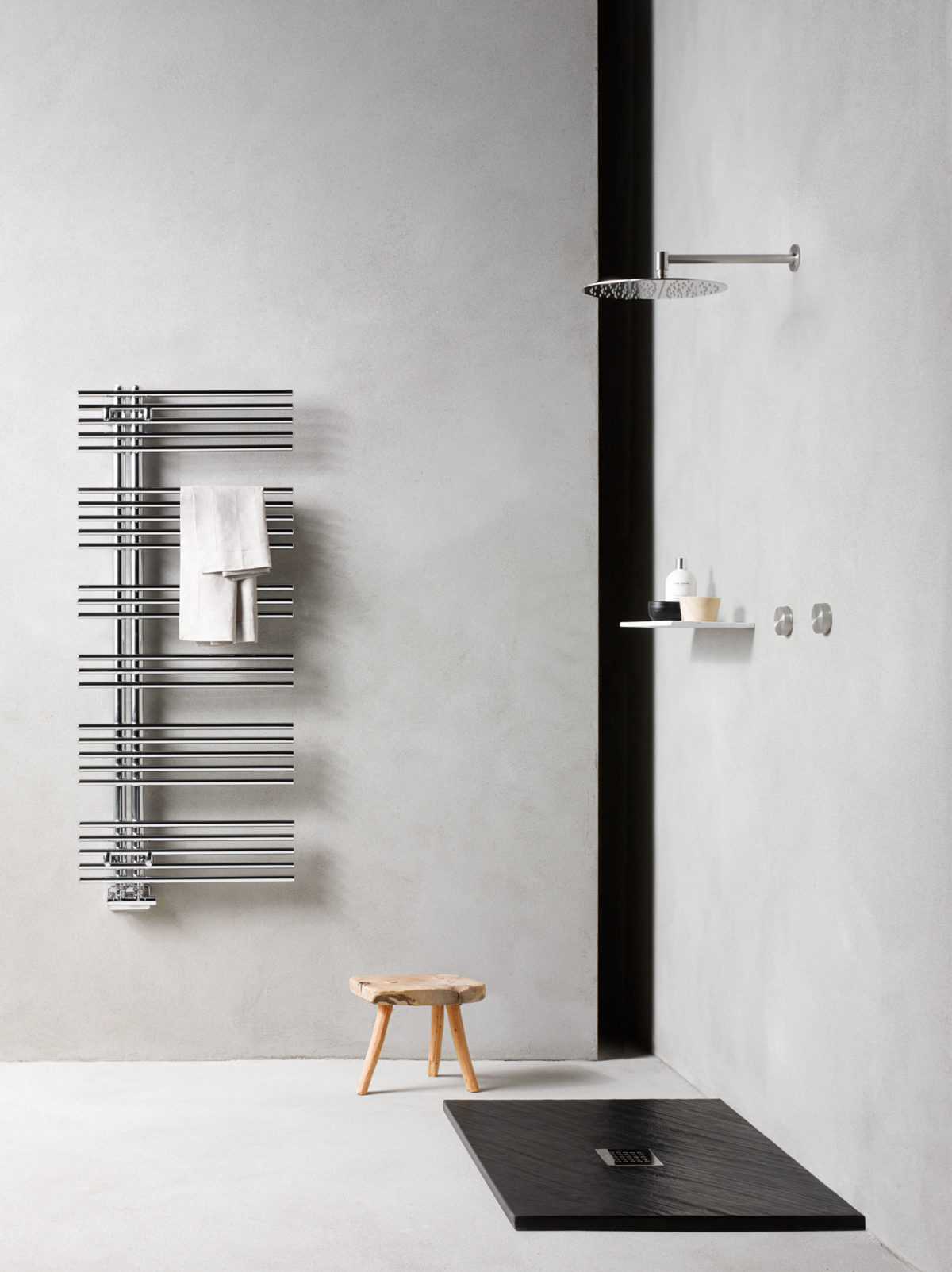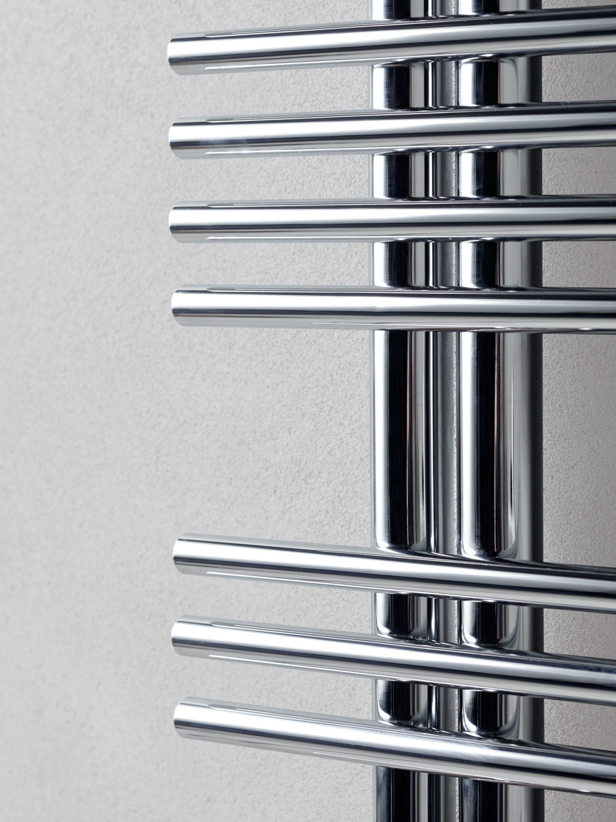 Ocelový ohřívač na ručníky vyrobený z vertikálních trubek o průměru 38 mm a vodorovně zaoblených trubek o průměru 20 mm.