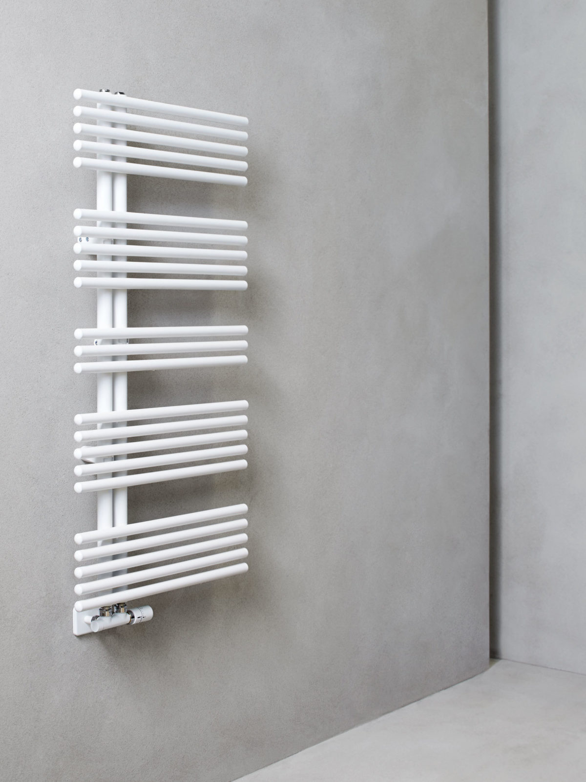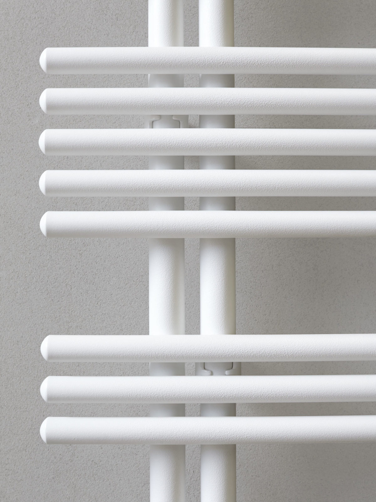 Ocelový ohřívač ručníků s roztečí 50 mm mezi tyčemi, vyrobený z vertikálních trubek o průměru 35 mm a vodorovně zaoblených trubek o průměru 25 mm.