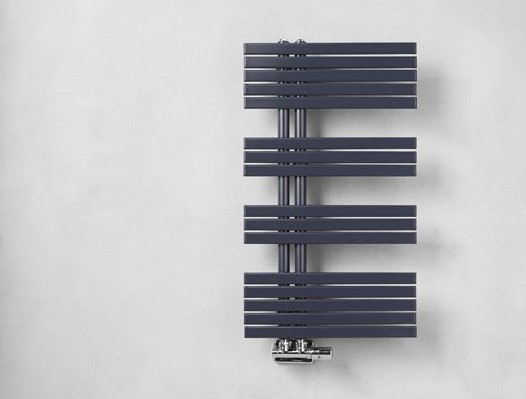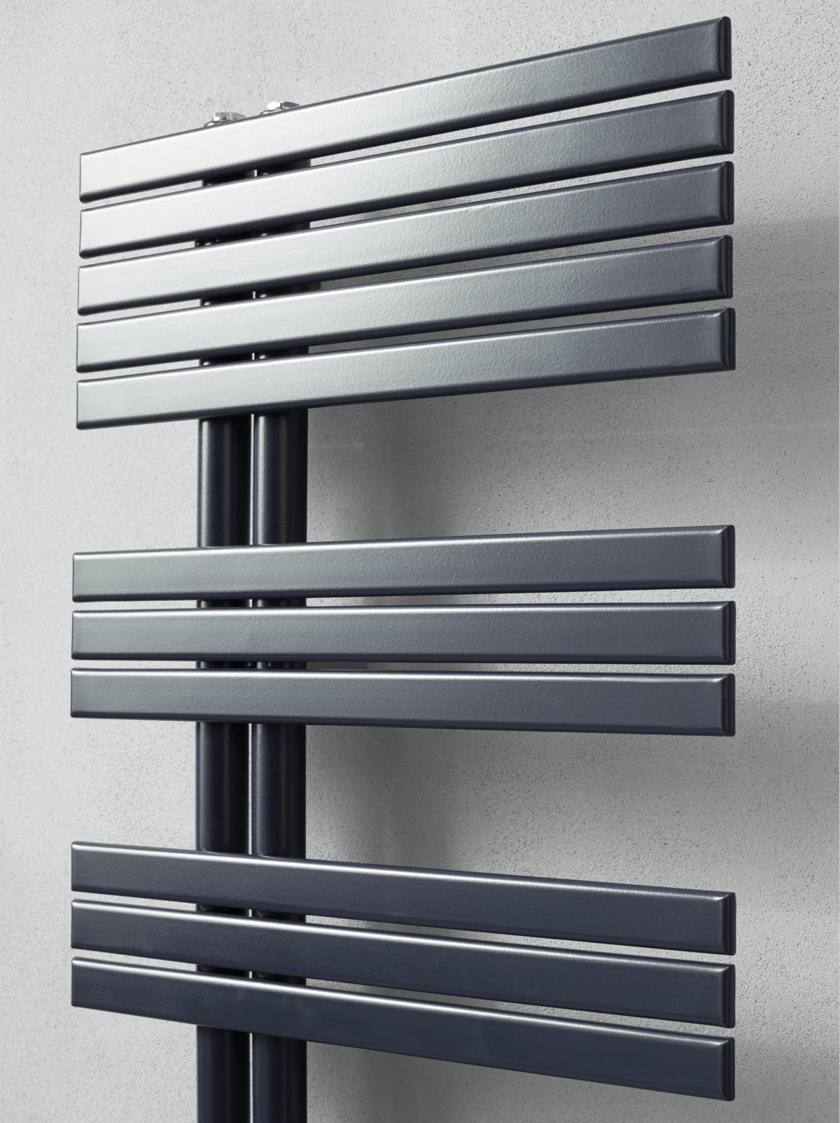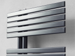 Ocelový ohřívač ručníků, vyrobený z vertikálních a vodorovných plochých trubek o průměru 35 mm.