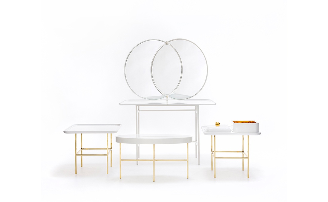 Klasické trojité toaletní zrcadlo bylo podtrženo ozdobným stolem Olympia, který důvtipně propojuje tři zrcadla. Zrcadla odrážejí diváka ze všech stran a opakují se jako olympijské kruhy.