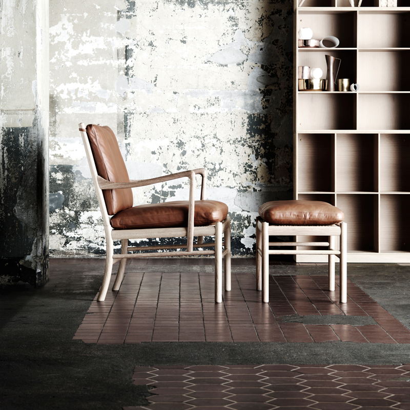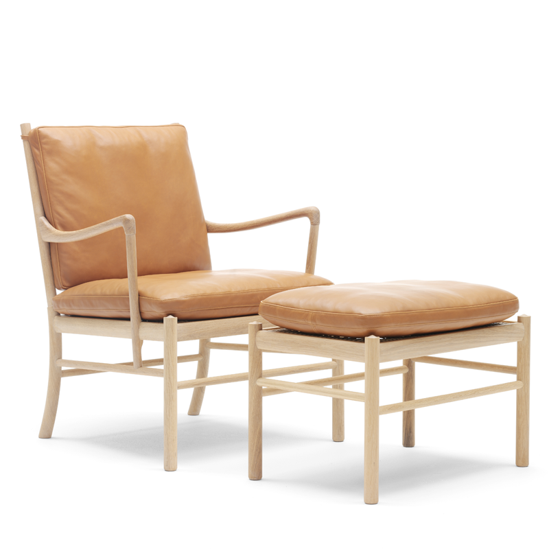 Židle Colonial má volně umístěné polštáře i sedadlo, které se lehce pohybuje v rámu se základnou z ručně tkané třtiny. Stejně jako pohovka z kolekce Colonial se židle vyrábí z mahagonu, ořechu a dubu s potahy z látky nebo kůže.