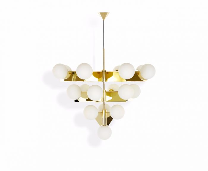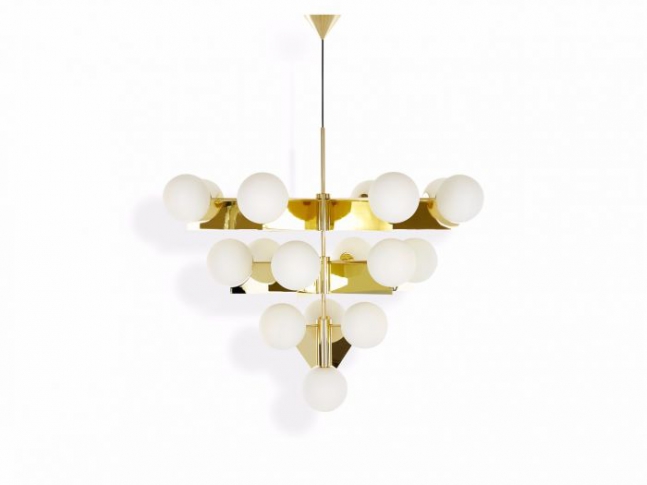 Lustr s mosazným povrchem složený ze čtyř pater. Na každém patře zajišťují světlo skleněné koule se žárovkou. Lustr se bude vyjímat v hotelové hale stejně jako ve vašem obývacím pokoji. Dostupný ještě v menší variantě.
