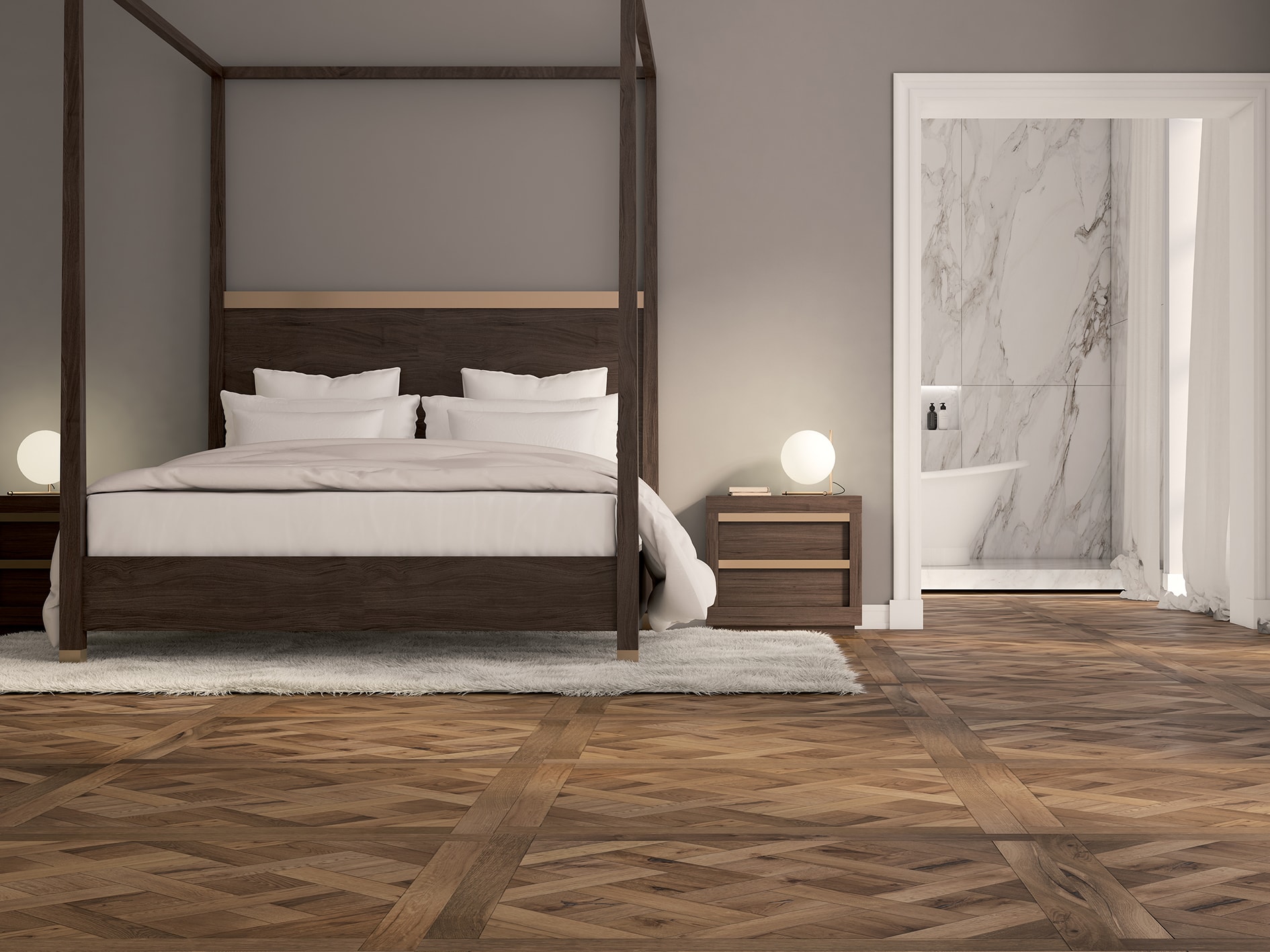 Elegance paláce z 18. století: Podlaha Alma Versailles z Design Collection zahrnuje luxus a třídu nadčasových parket. Dokonale vložené ručně vyráběné čtverce vytvářejí geometrické vzory s nádherným efektem.