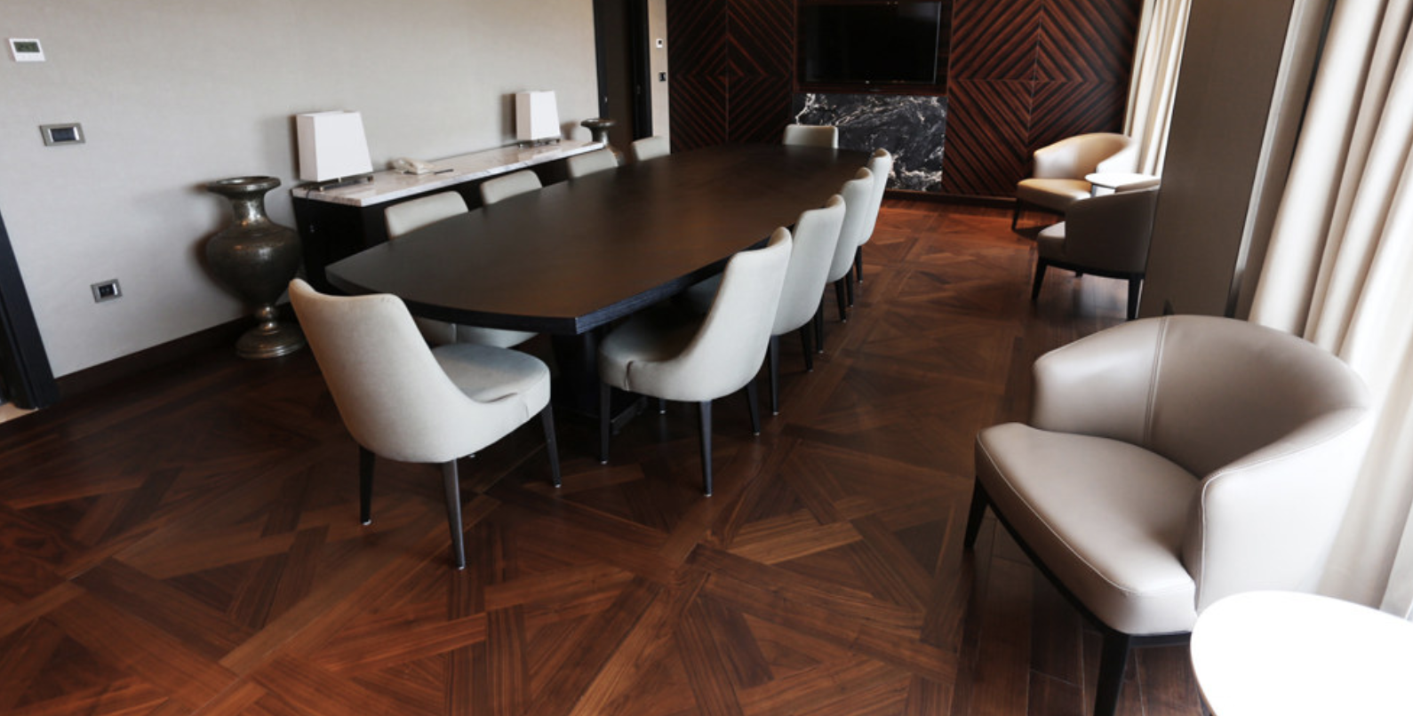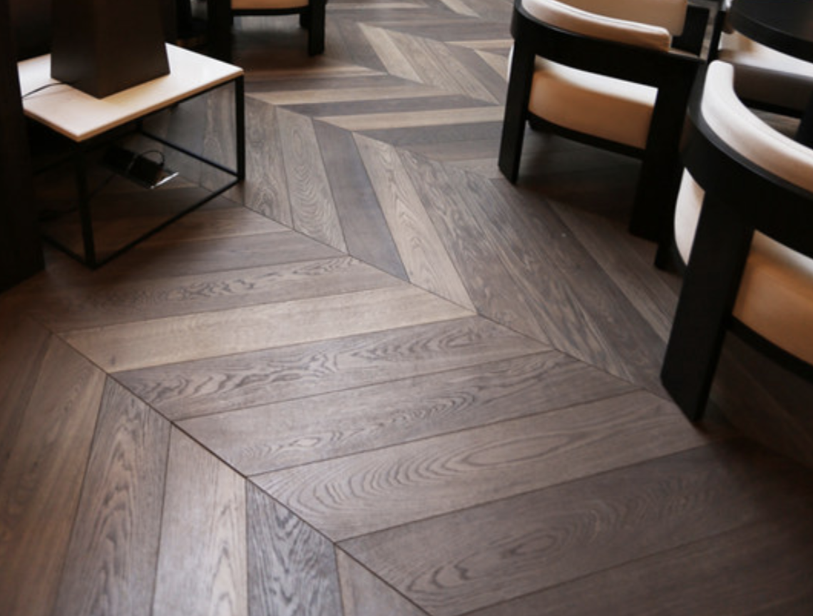 Designová parketová podlaha Foglie d´Oro parquet v provedení Chevron a barvě Ca'Corner s jedinečným a vysoce estetickým vzhledem v realizaci hotelu a restaurace v Turecku.