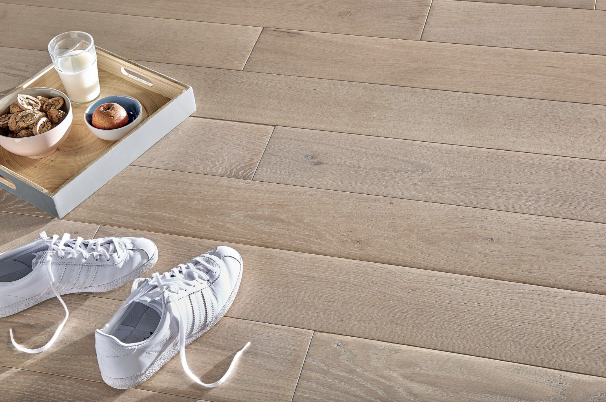 Myšlenka naolejované dřevěné podlahy, která je k dispozici v kolekci „Daylight Whites“, je ideální pro vnitřní podlahy, které jsou koupány v přirozeném světle. Nic nepřemění prostor lépe a zve vás, abyste jej viděli v jiném světle.
