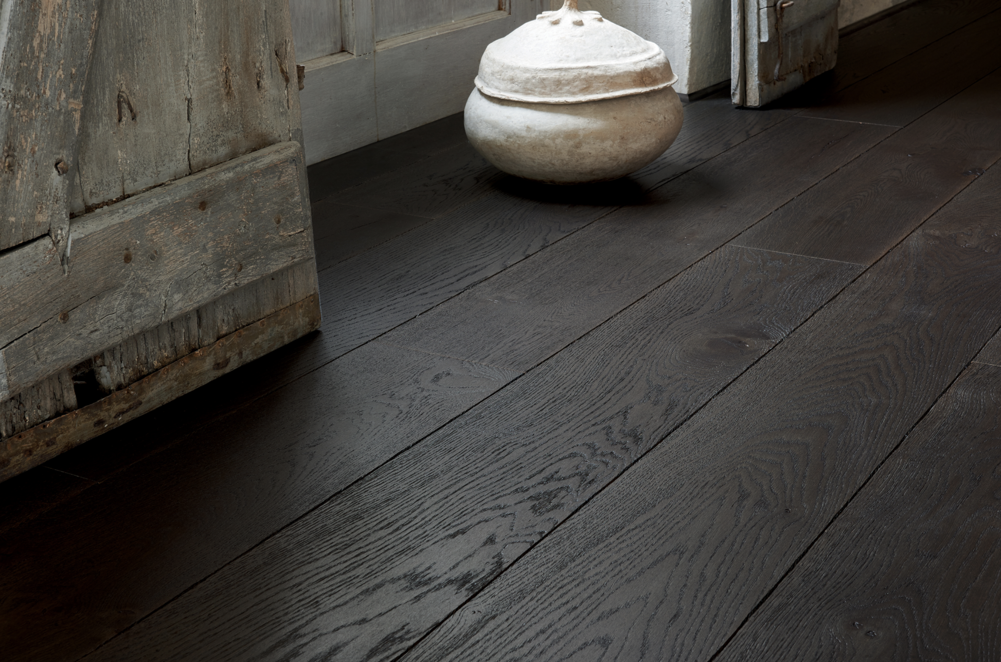 Díky vzhledu blízkému svému původu, který je poznamenán uzly a zabarvením, prasklinami a stopami jádrového dřeva, dub bez omezení přebírá všechny své zvláštnosti. Tato černá plovoucí dřevěná podlaha se také vyznačuje svou barvou, téměř černým odstínem hnědé barvy podobné rašelině, s olejovaným povrchem aplikovaným v našich továrnách. Elegance na úrovni terénu.