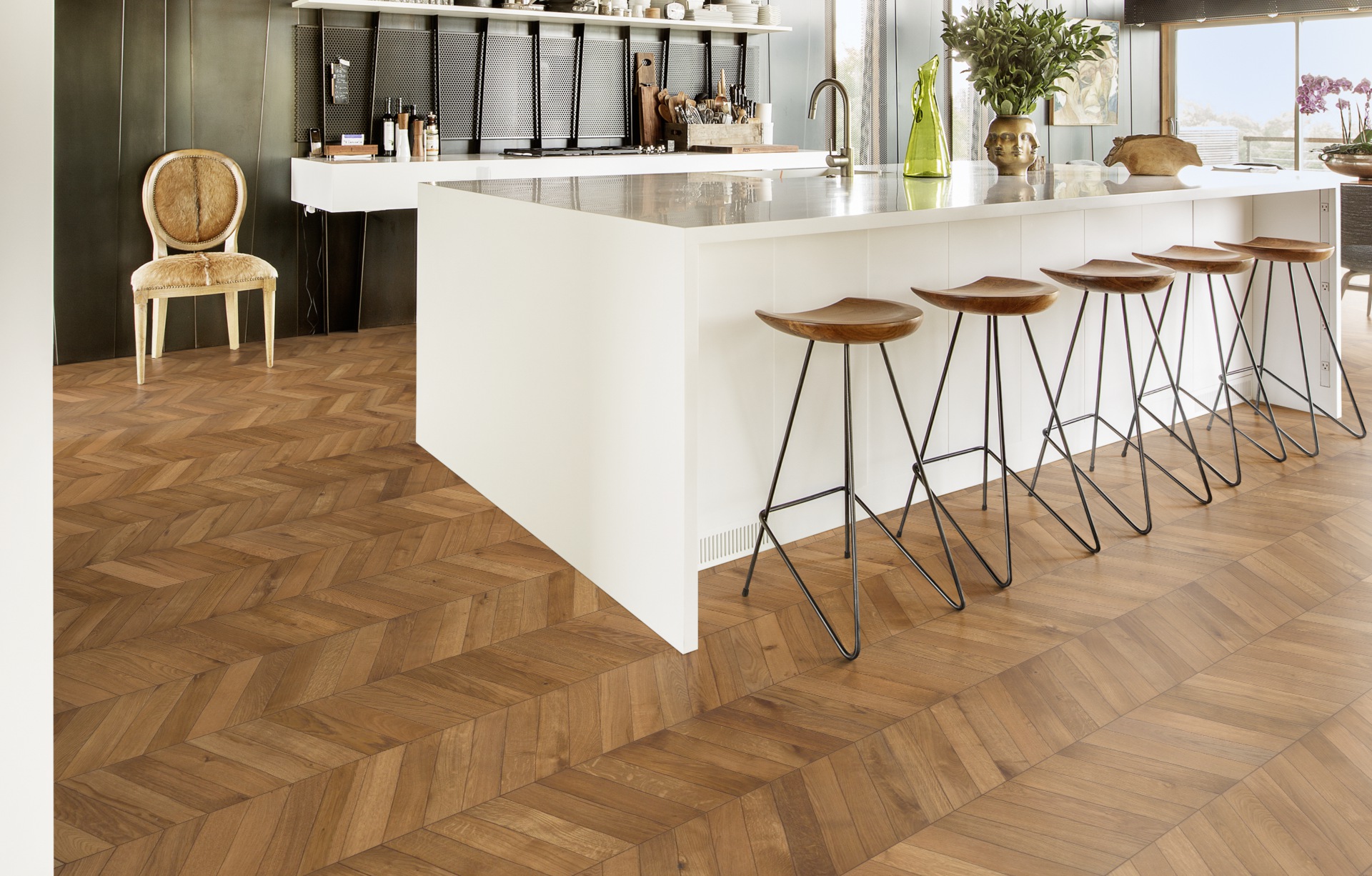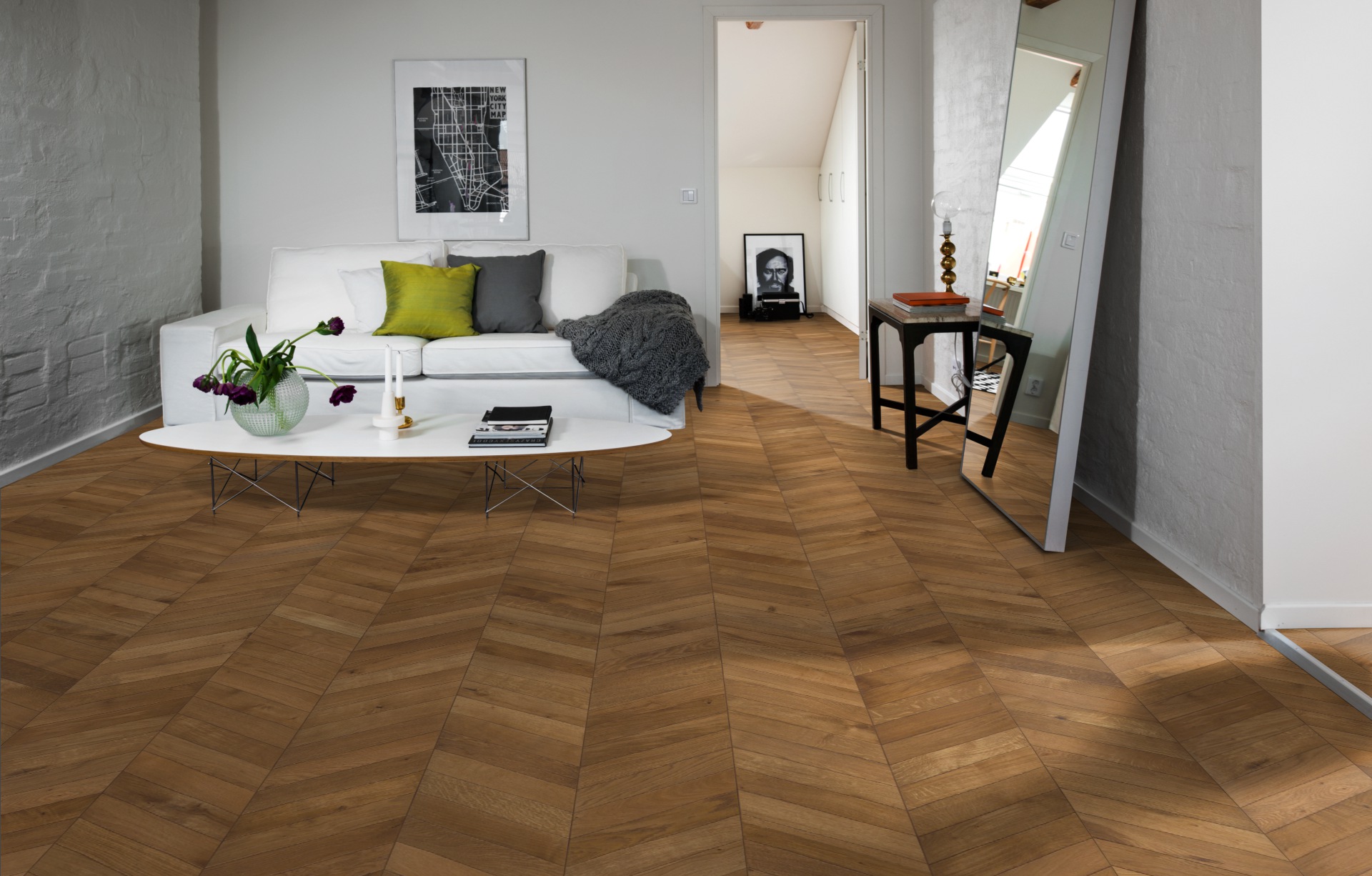 Tepelná úprava dubového dřeva zlepšuje odolnost proti nasákavosti vodou a dodává podlaze krásný tmavý odstín, povrch je kartáčovaný a ručně škrábaný - mohou se objevit malé součky, které dodají podlaze punc rustikálních parket. Podlaha je 3-vrstvá, dubové lamely 4 mm výšky jsou na desky kladeny do maďarského vzoru CHEVRON- rozměr desky 1842 x 305 x 15 mm.
