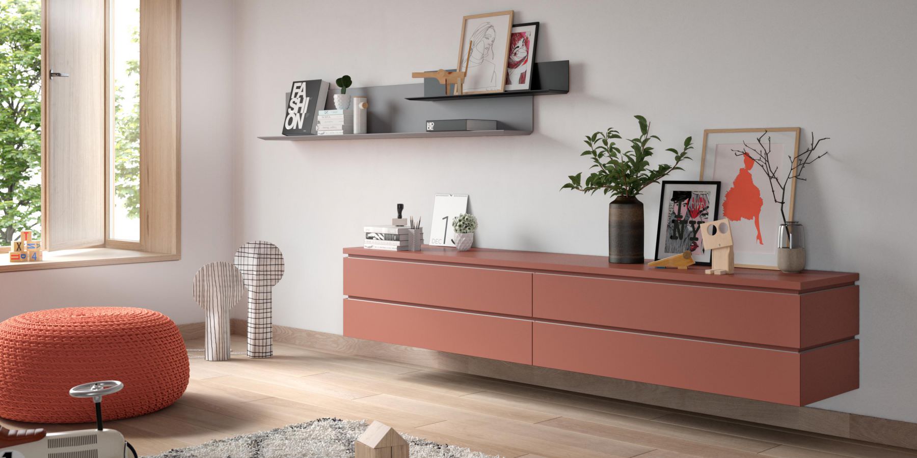 Koncept lilu je založen na polici a stěnové jednotce, která kombinuje oba v jediném úhlu, a proto překvapivě umožňuje širokou konstrukční volnost na libovolném volném povrchu stěny.