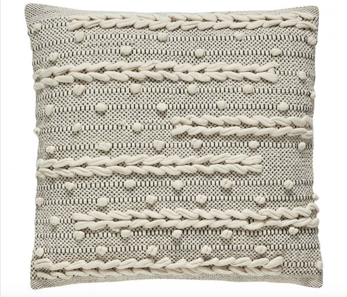 Polštář Cushion je součástí kolekce bytových doplňků. Potah se skládá z bavlny, která dodává jemnost, zatímco výplň měkkost a pohodlí. Tkanina tvoří na textuře vystouplý, plastický řetízkový vzor doplněný o malé bambulky. Praktický doplněk do obývacího pokoje i do ložnice je dostupný v tónech černobílé barvy.