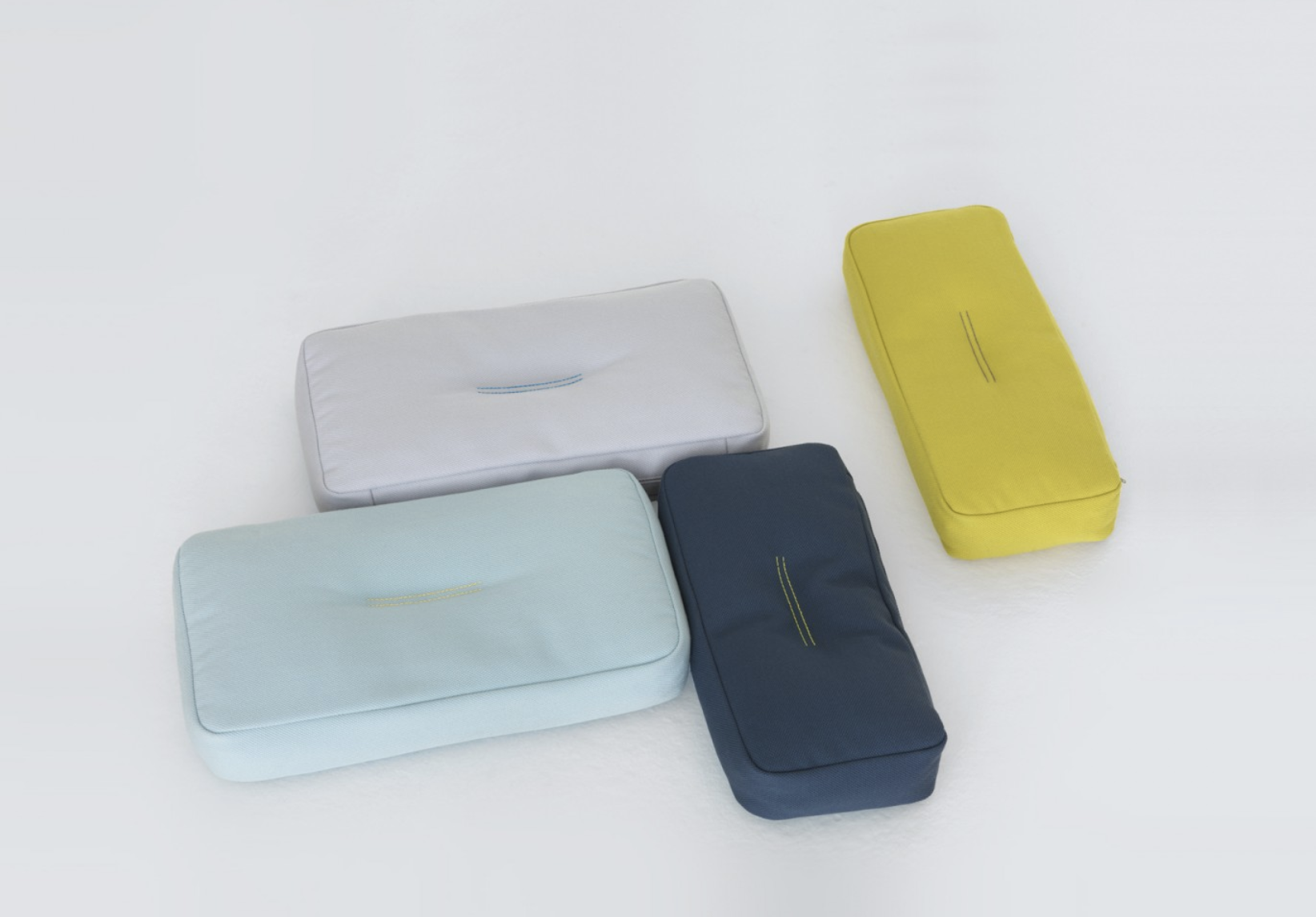 Polštáře Lori a Ara z tkaniny Steelcut s barevným prošíváním.