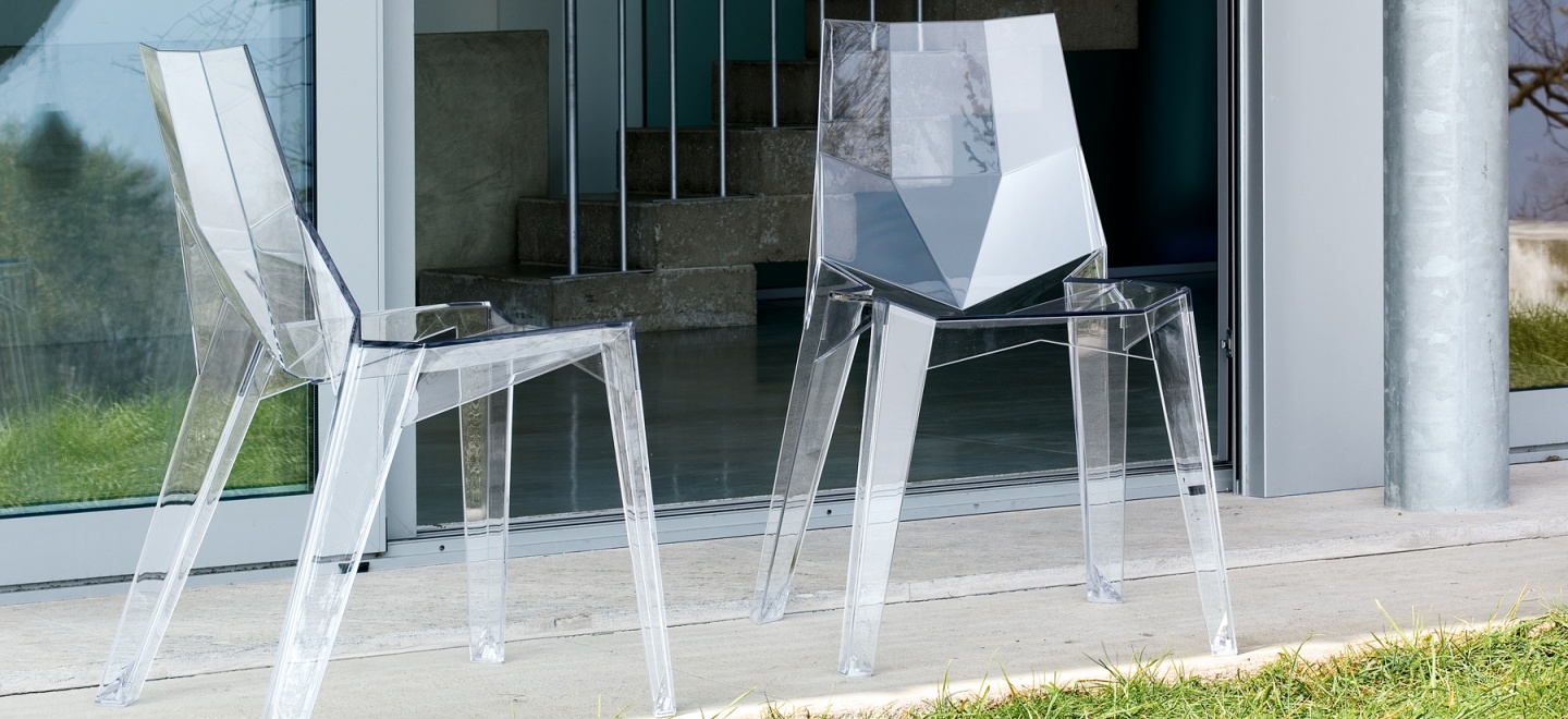 Plastová židle od Karima Rashida. Designéra, který se ve své tvorbě vyznačuje především hrou se světlem, barvami a originálním tvarováním. Jiná není ani židle Poly, která je vyrobena z jednoho kusu polykarbonátu/polyamidu. Hodí se do interiéru i exteriéru a je stohovatelná.