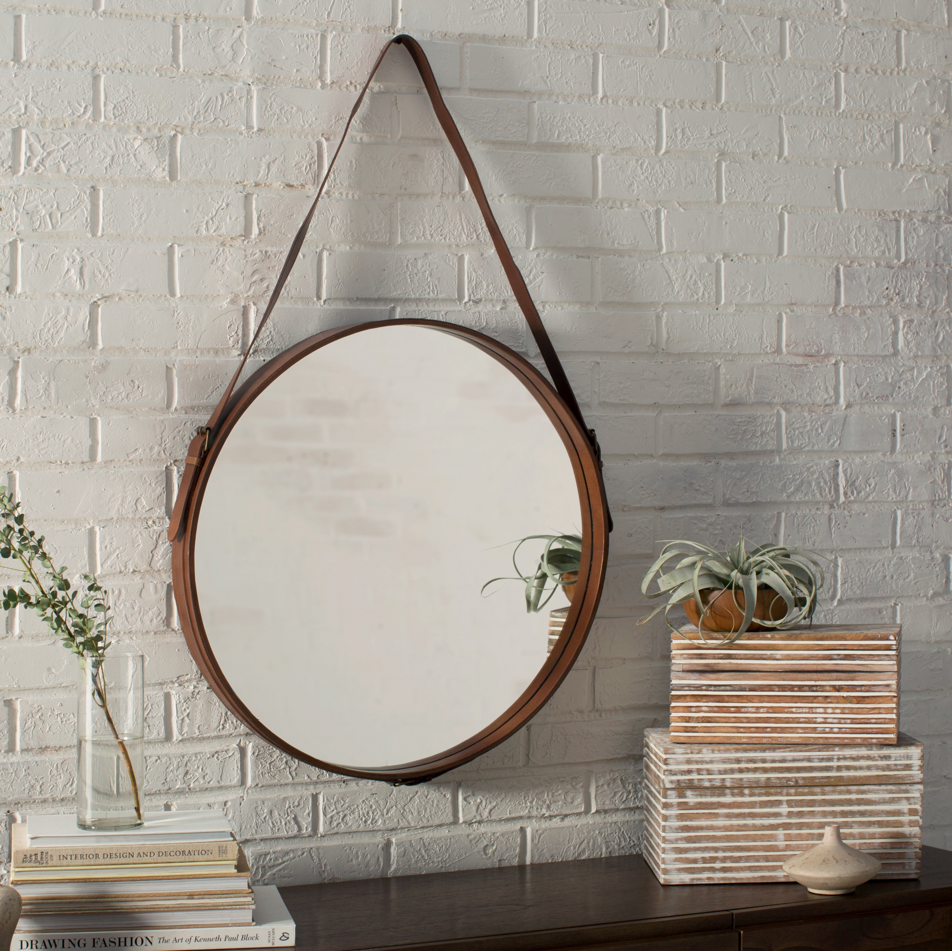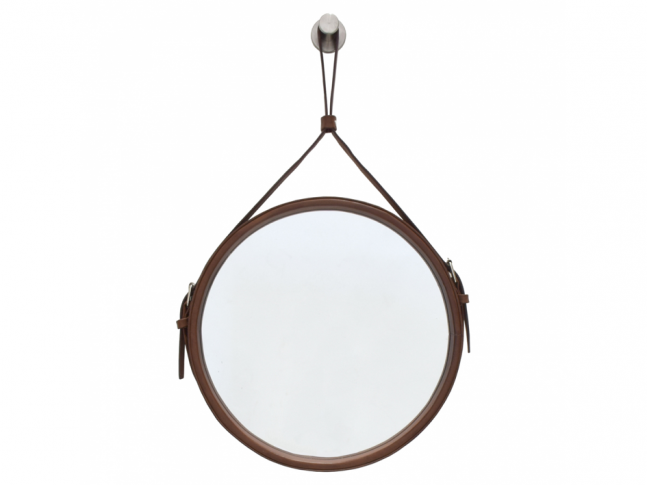 Kulaté zrcadlo zavěšené na koženém pásku. Výrobce: POP UP HOME