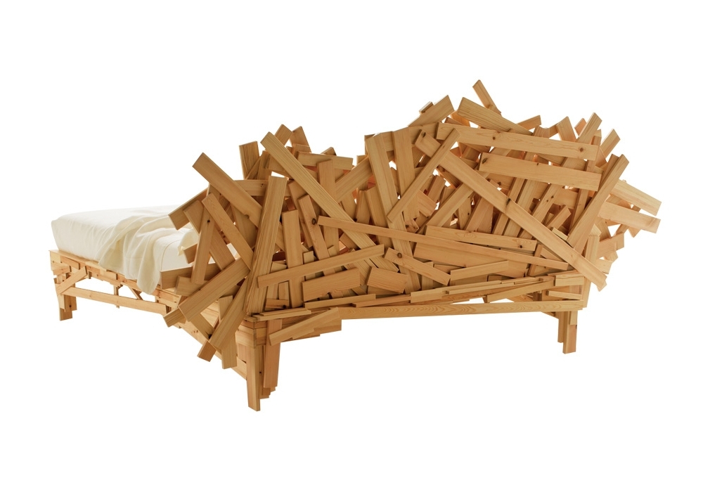 Postel Favela s borovicovými pásy různých velikostí, ručně spojenými a přibíjenými na sebe záměrně náhodným způsobem. Realizace dělá z každého lůžka jedinečný kus.