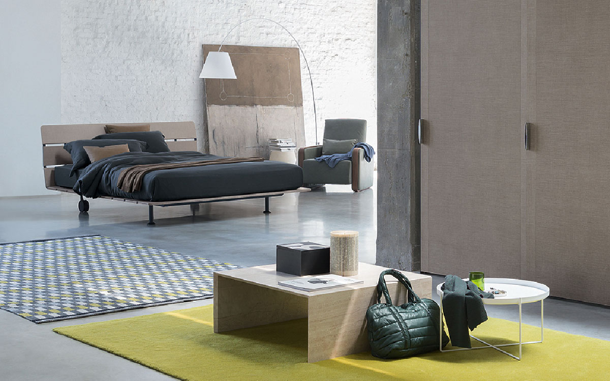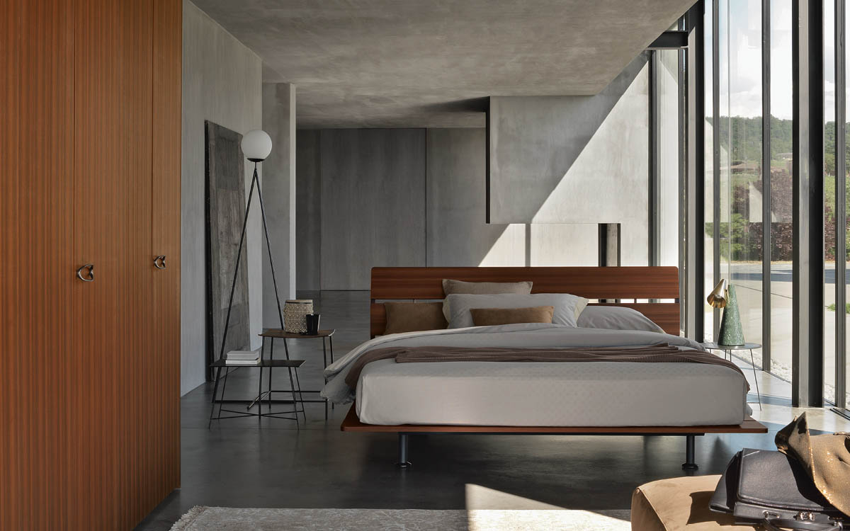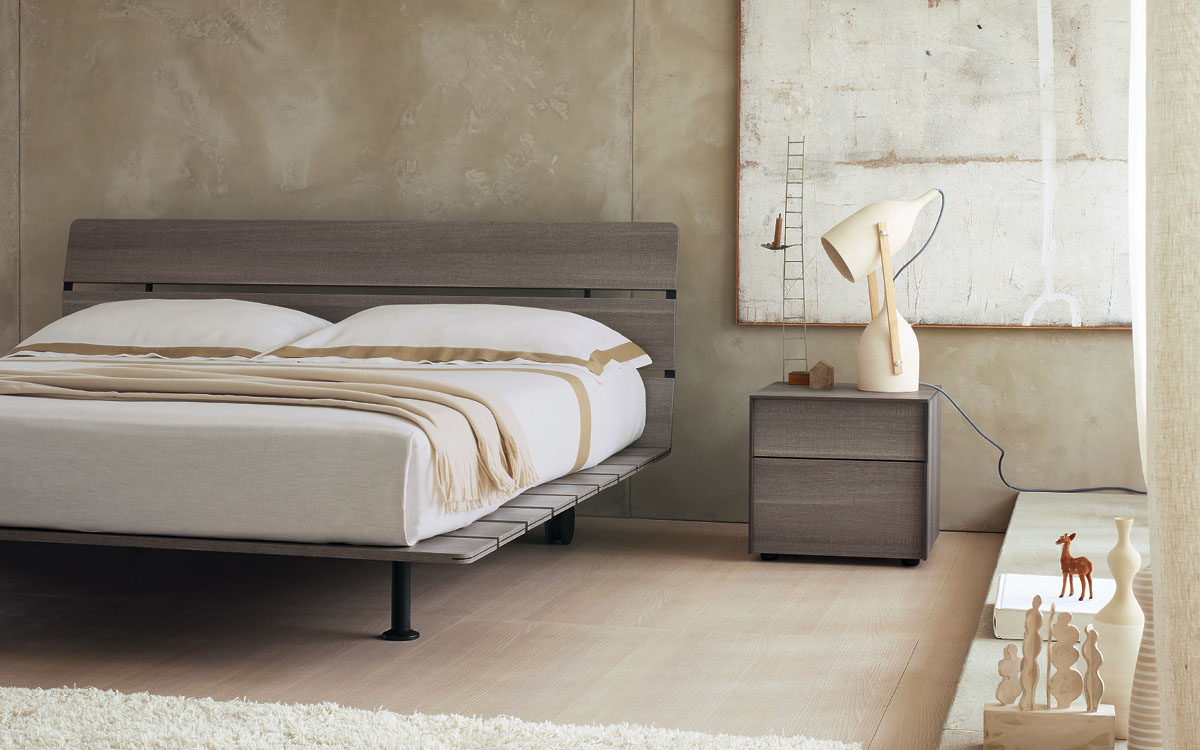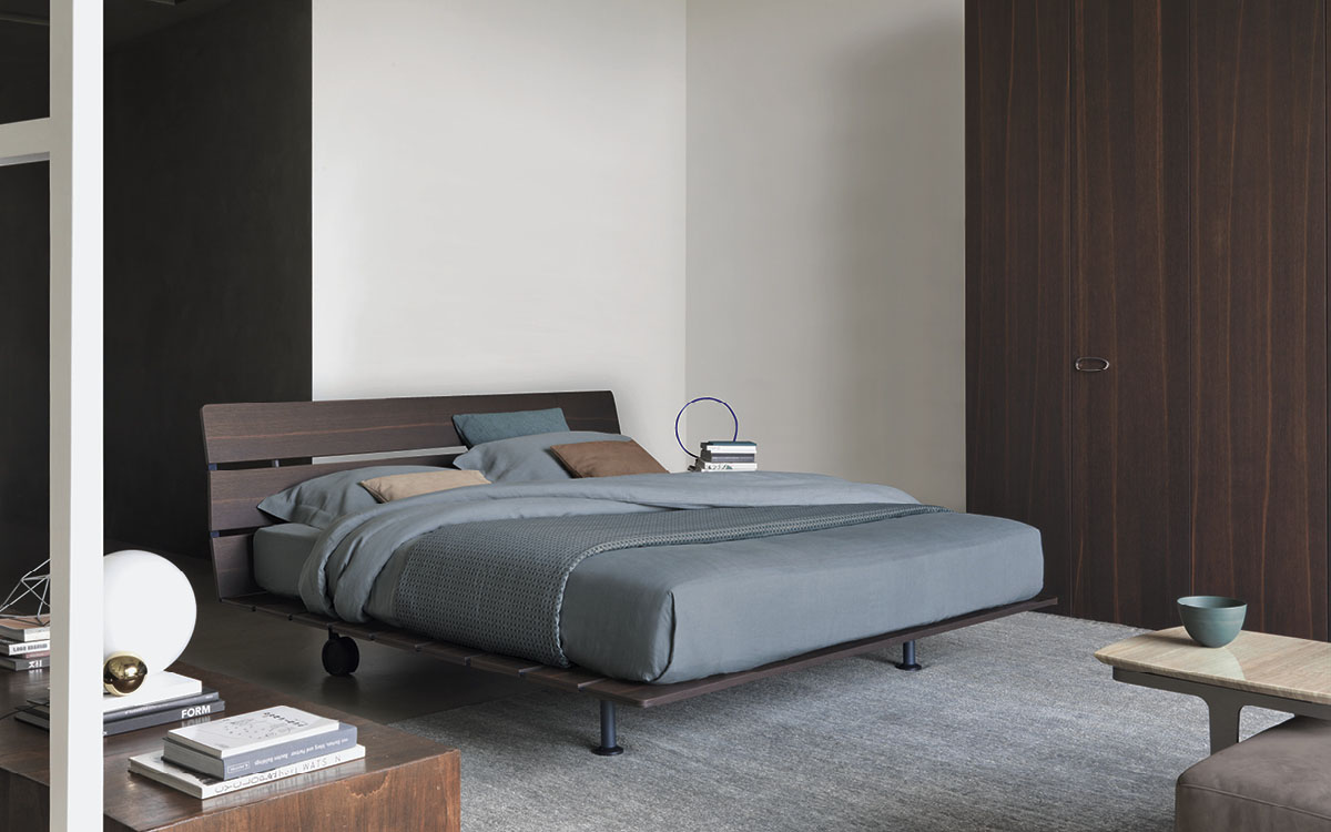 Jednoduchá a originální, to je postel Tadao, jejíž rošt plynule přechází v čelo postele. Základna je k dostání v mnoha lakovaných nebo přírodních dřevených variantách.