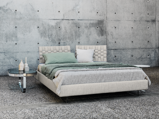 Postel Limes zachovává inteligentní funkčnost, která charakterizuje linku pohovky. Zdá se, že lehký mobilní ostrůvek se vznáší na jeho 14 cm obdélníkových průhledných nohách.