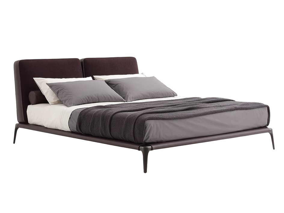 Nápaditá postel s čalouněnými čelními polštáři a důmyslnými detaily uchycení roštu k rámu postele.