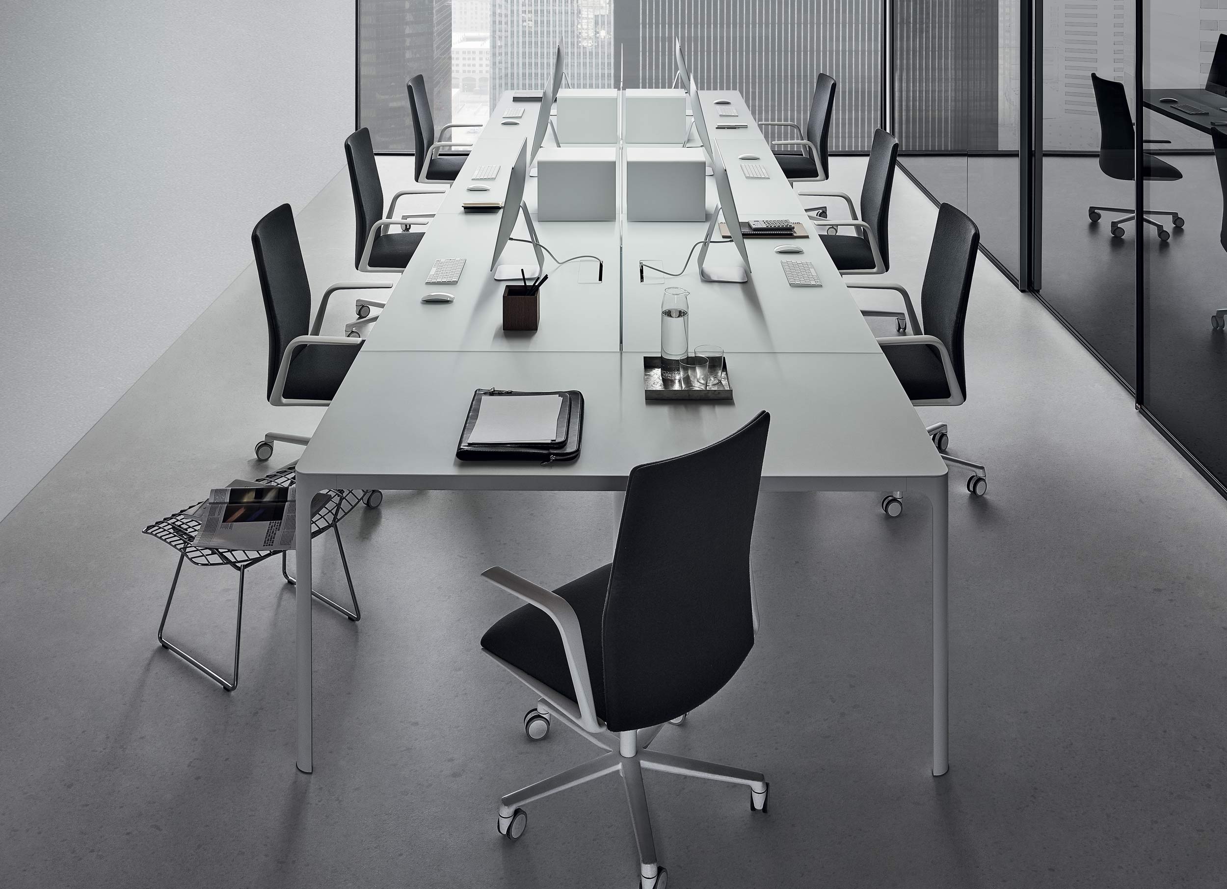 Systém stolů určený pro profesionální prostory s extrudovanou hliníkovou konstrukcí a skleněnou deskou. Přirozený vývoj stolu, Flat System poskytuje konfigurace s koncovým a bočním pracovním prostorem a širokou škálu specifického vybavení a příslušenství.