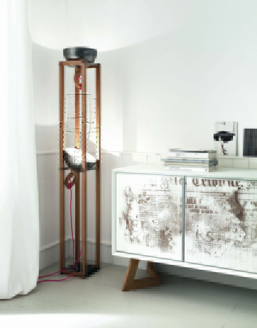 Vysoká stojací lampa s rámem z aljašského dubu. Dubový je také kruh, kterým může být lampa nasměrována do různých stran.