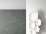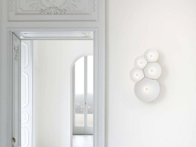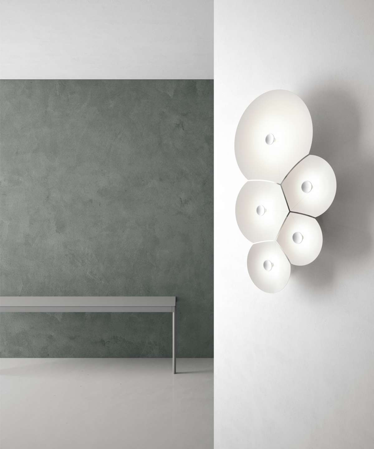 Polokoule různých velikostí se protínájí, aby vytvořily charakteristická geometrická forma mýdlových bublin; kónické, široké a ploché tvary, každý složený ze siluety v bílém polykarbonátu.