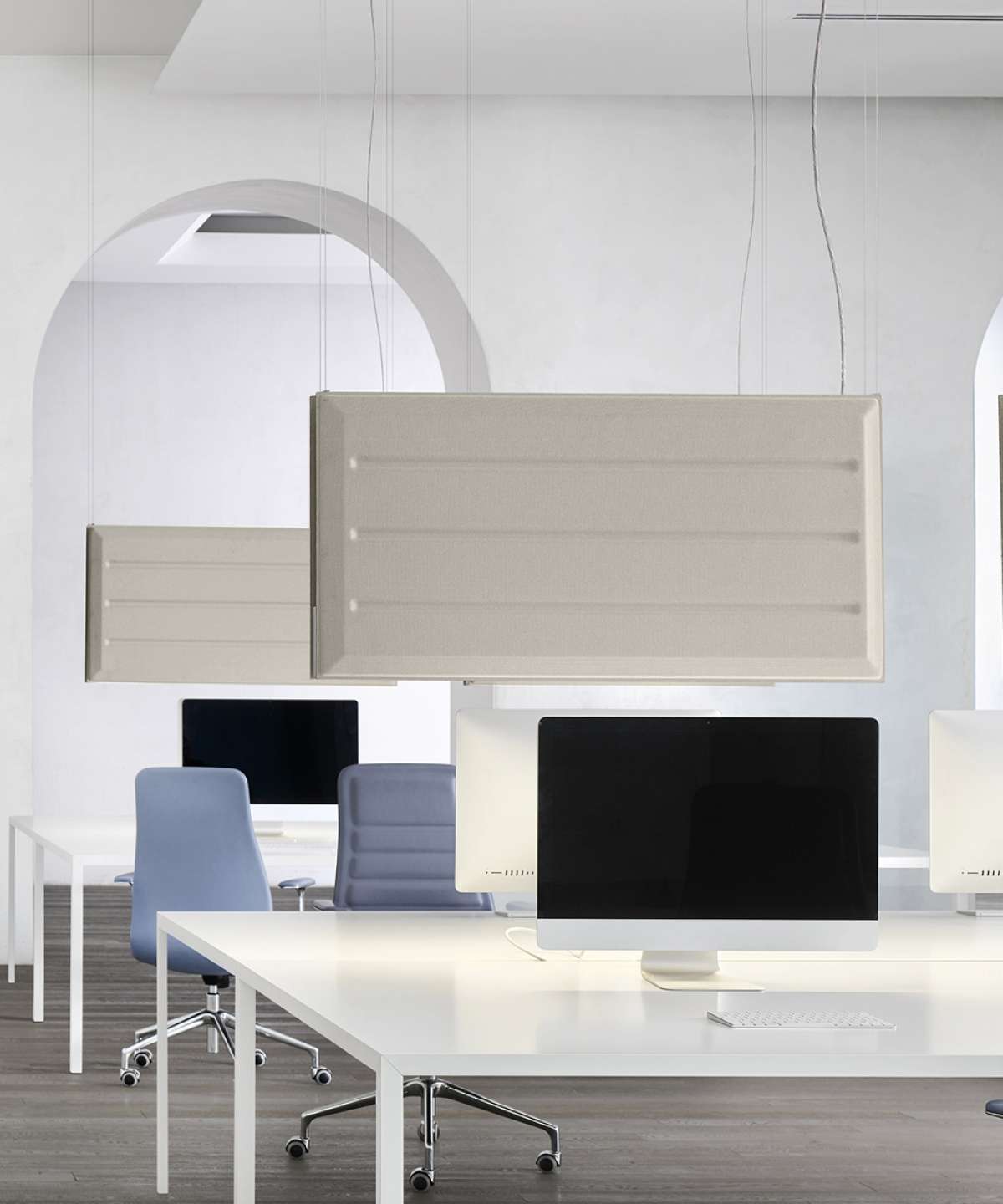 Lineární LED lampa ideální pro pracoviště; modulární architektonický prvek schopný definovat prostor a přizpůsobit se kontextu.
