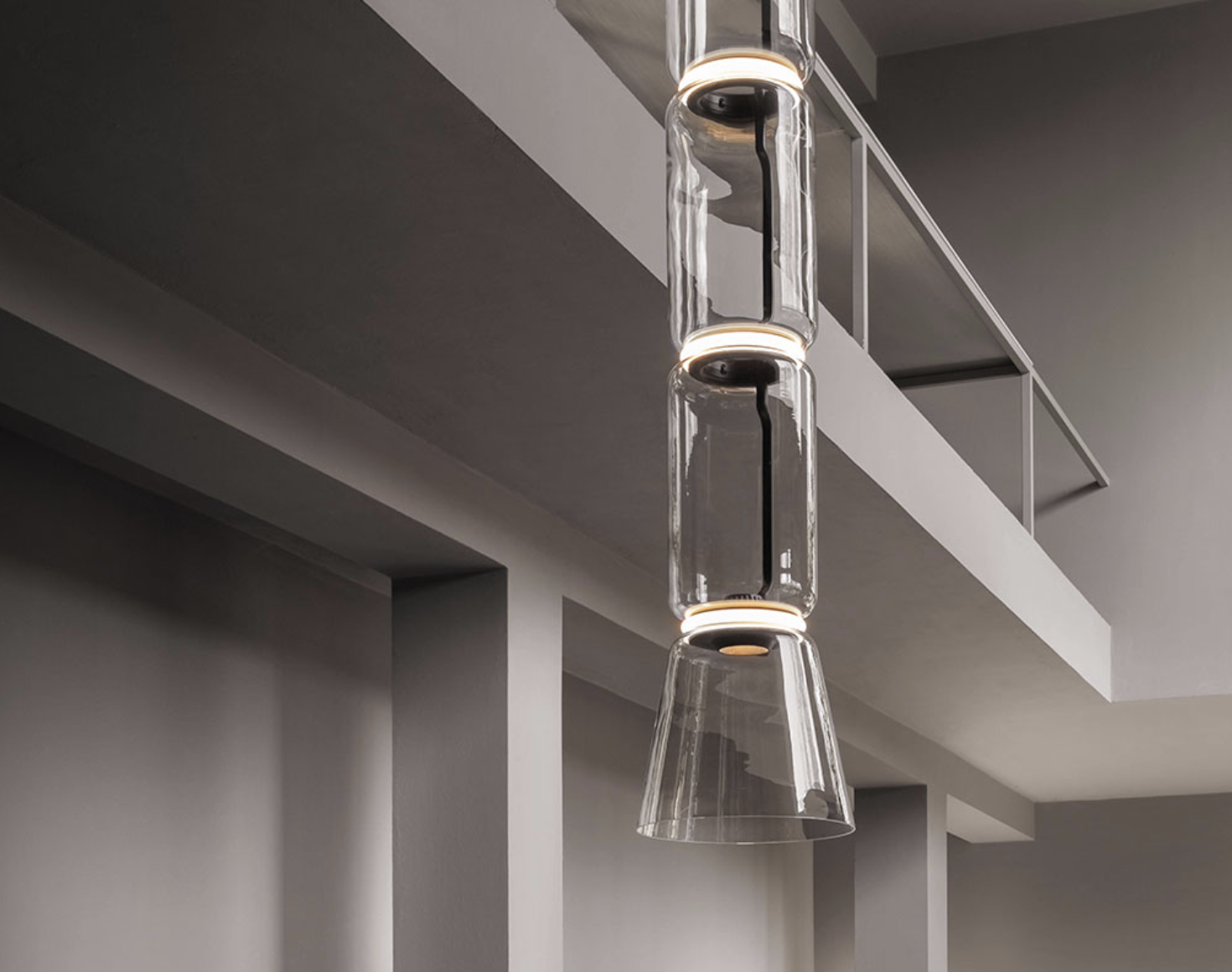 Závěsné svítilny skládající se z propojovacích skleněných modulů dosahujících délky až 3,2 mt. se zavěšeným napájecím kabelem 4 mt. (157,48"). Válcovitá a polosférická transparentní foukaná skleněná konstrukce, zavěšený hliníkový prstencových konektorů z lité oceli.