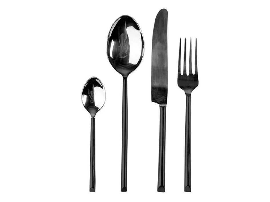 Sada 4 ks příborů Cape Town Black obsahuje lžíci, vidličku, nůž a lžičku. Příbory jsou vyrobeny z černé nerez oceli a lze je mýt v myčce.