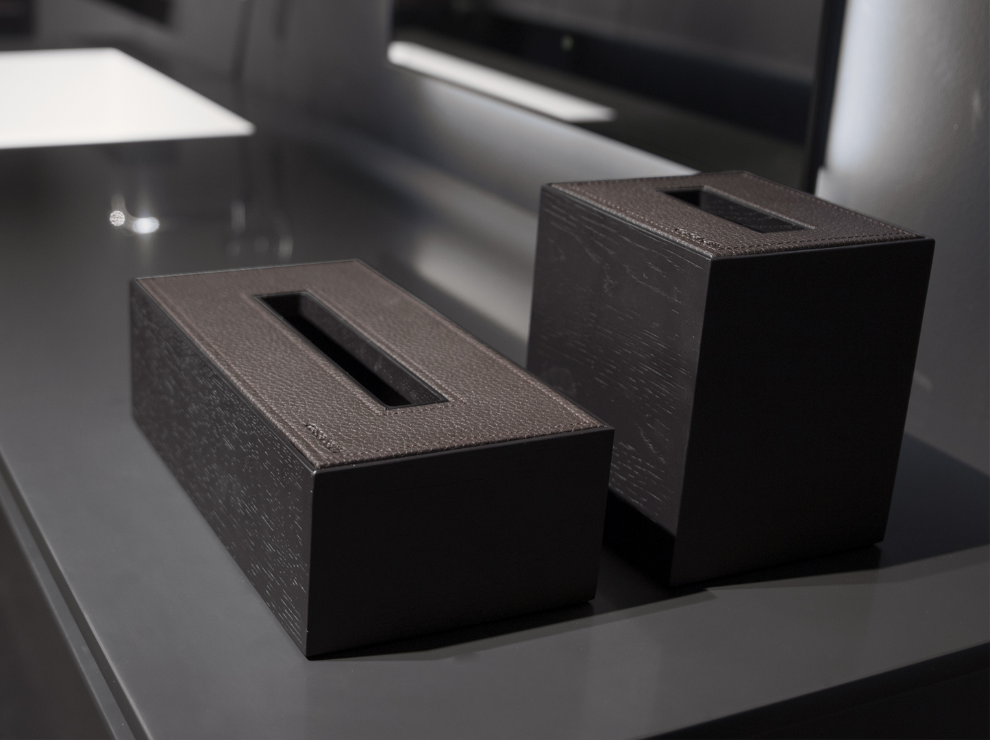 Skladovací kontejnery nebo přihrádka na ubrousky z masivního dubu potažené eko kůží.