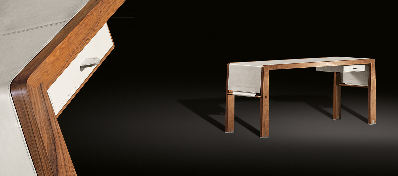 Psací stůl vyrobený z pevného, leštěného javoru. Zásuvka je pokryta sedlovou kůží s kovovou vložkou. Špičky nohou jsou z kartáčovaného poniklovaného kovu. Kompletně snímatelný potah je k dispozici v různých odstínech sedlové kůže.
