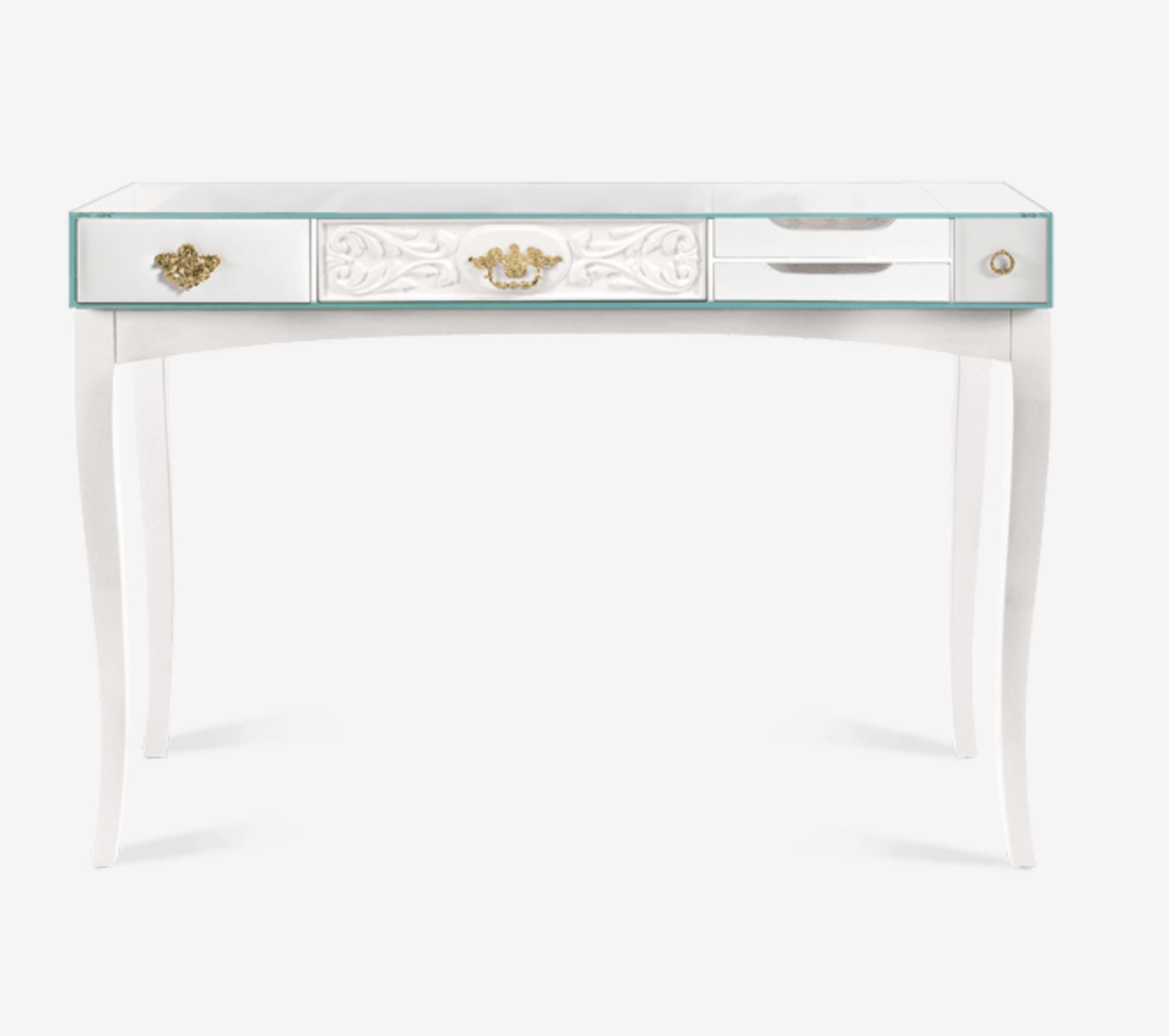 Psací stoly Soho jsou vyrobeny ze dřeva a tvrzeného skla a skládají se z 5 zásuvek. Jejich základna je vyrobena z lakovaného dřeva. Obsahuje zásuvky s ručně vyrobenými čely lakovanými.
