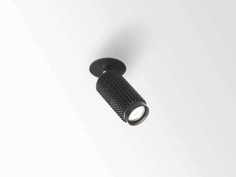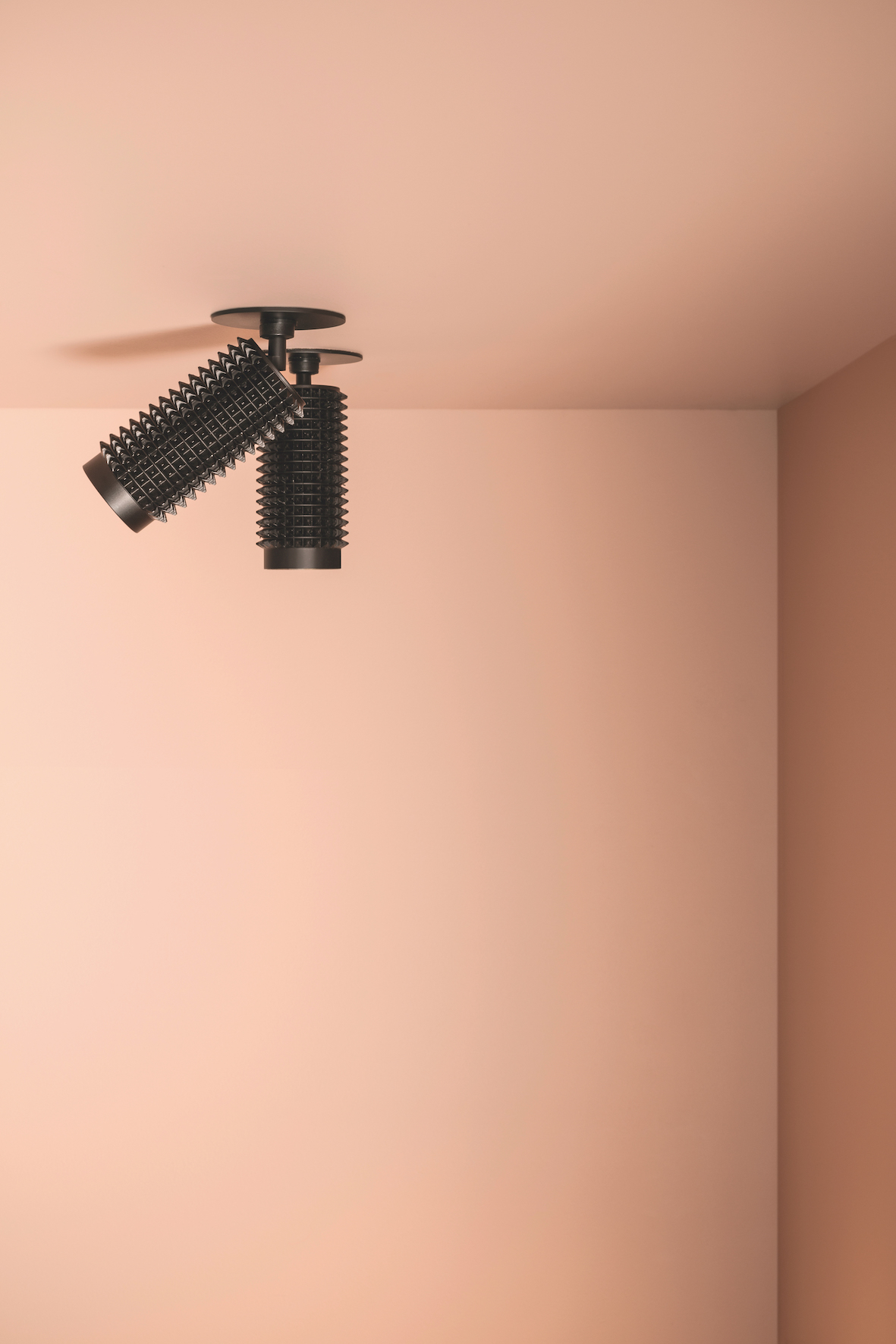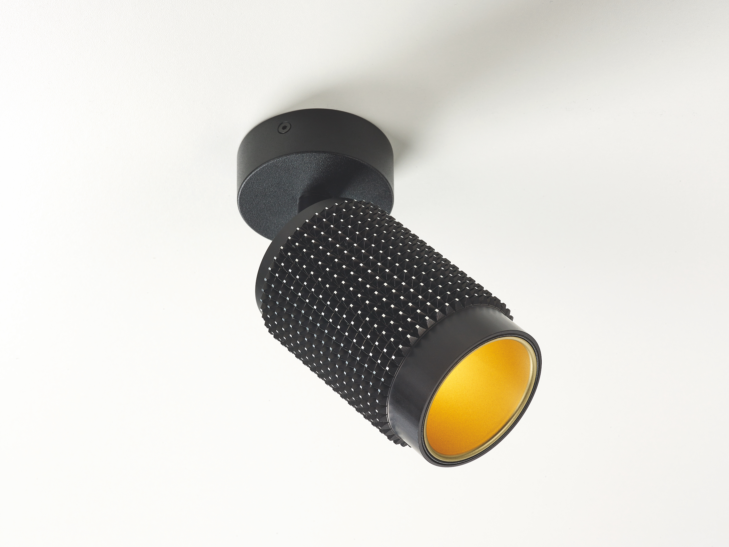 Stropní svítidla z kolekce Punk jsou k dispozici jsou v černé, zlaté champagne a speciálním povrchu hliníku lakovaného na černo s přebroušenými hranami Black Pure.