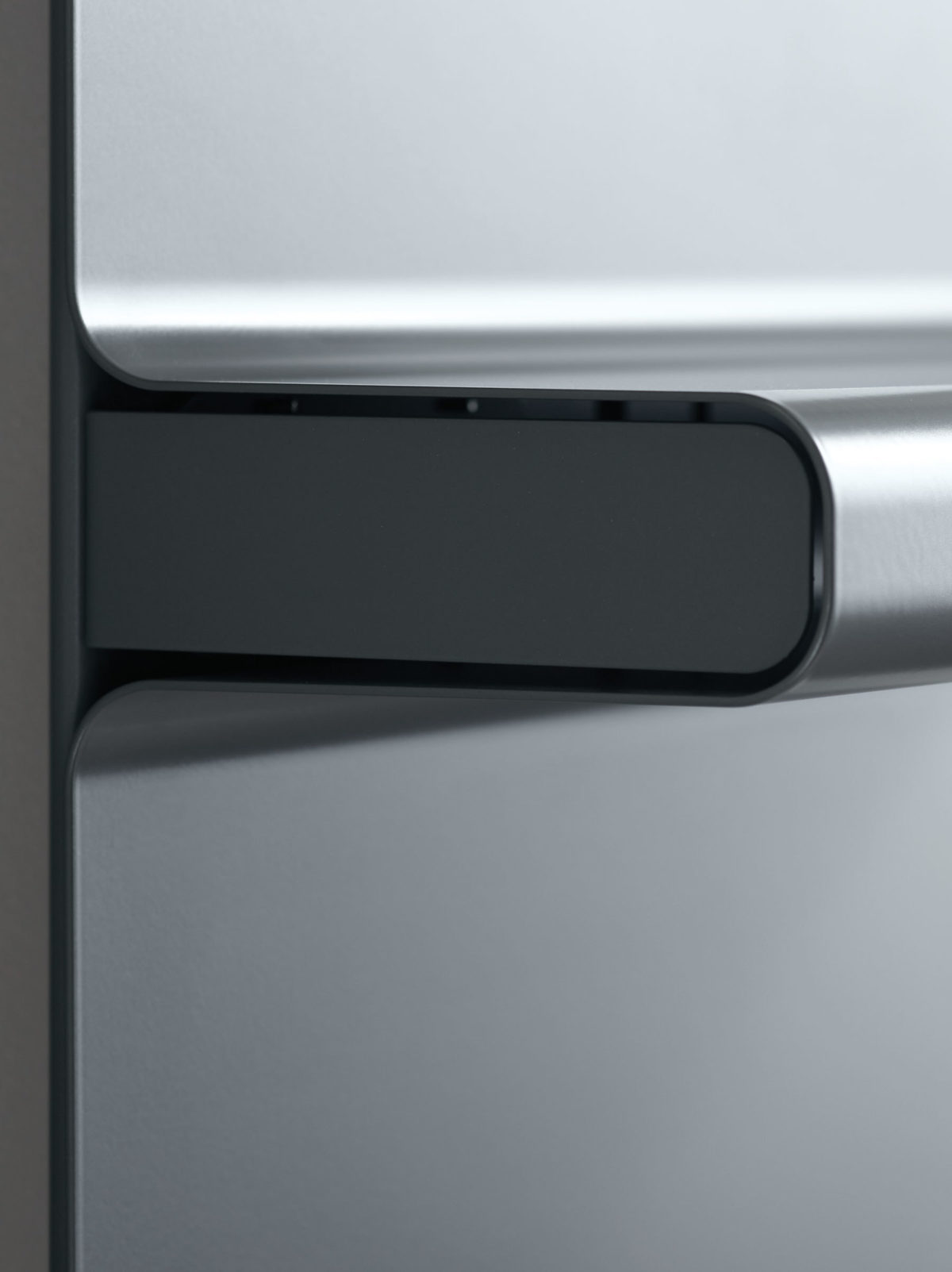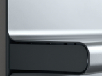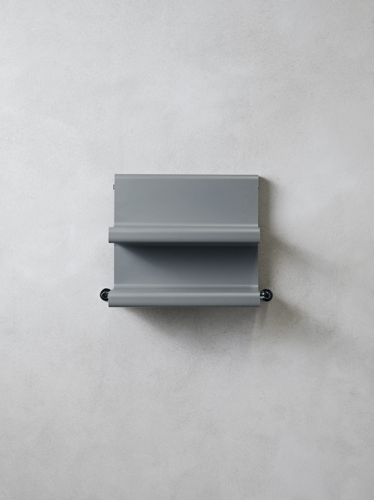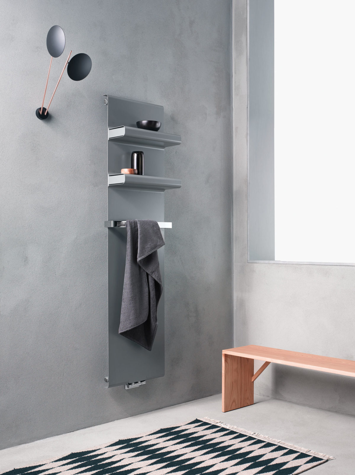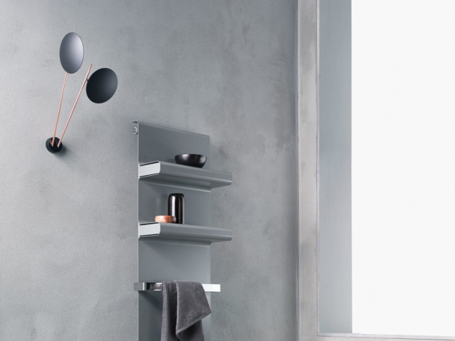 Minimální deska s integrovanými policemi se stává víceúčelovým nábytkem.