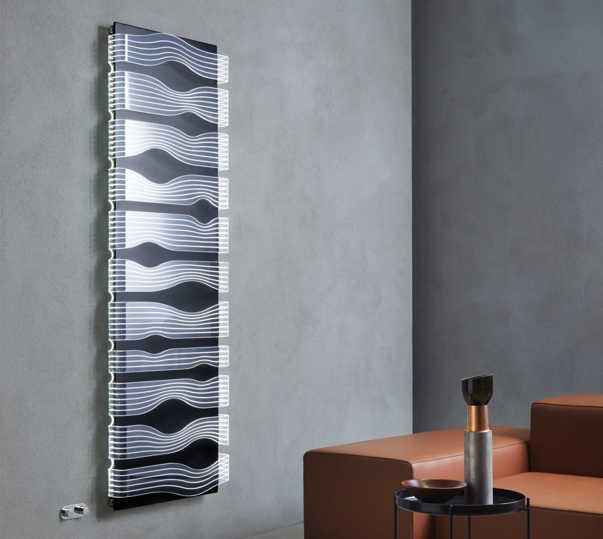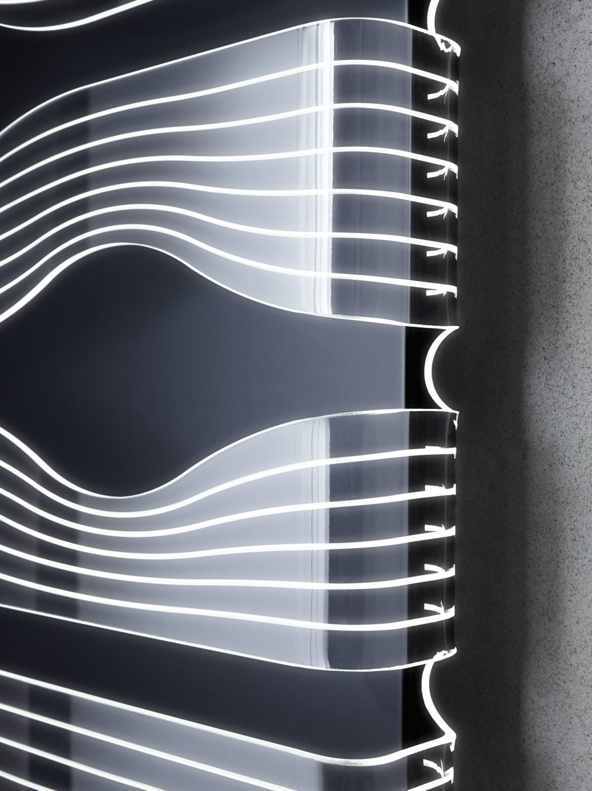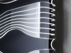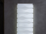 Tenká barvená ocelová deska obklopená metakrylátovou konstrukcí, která je podsvícená LED osvětlením.