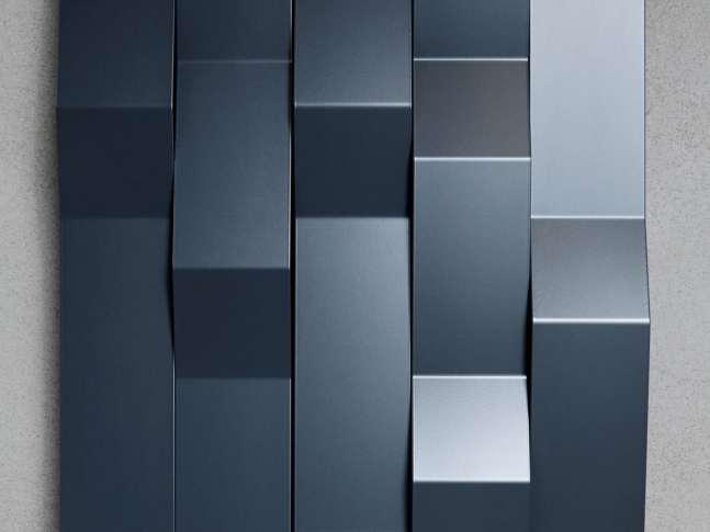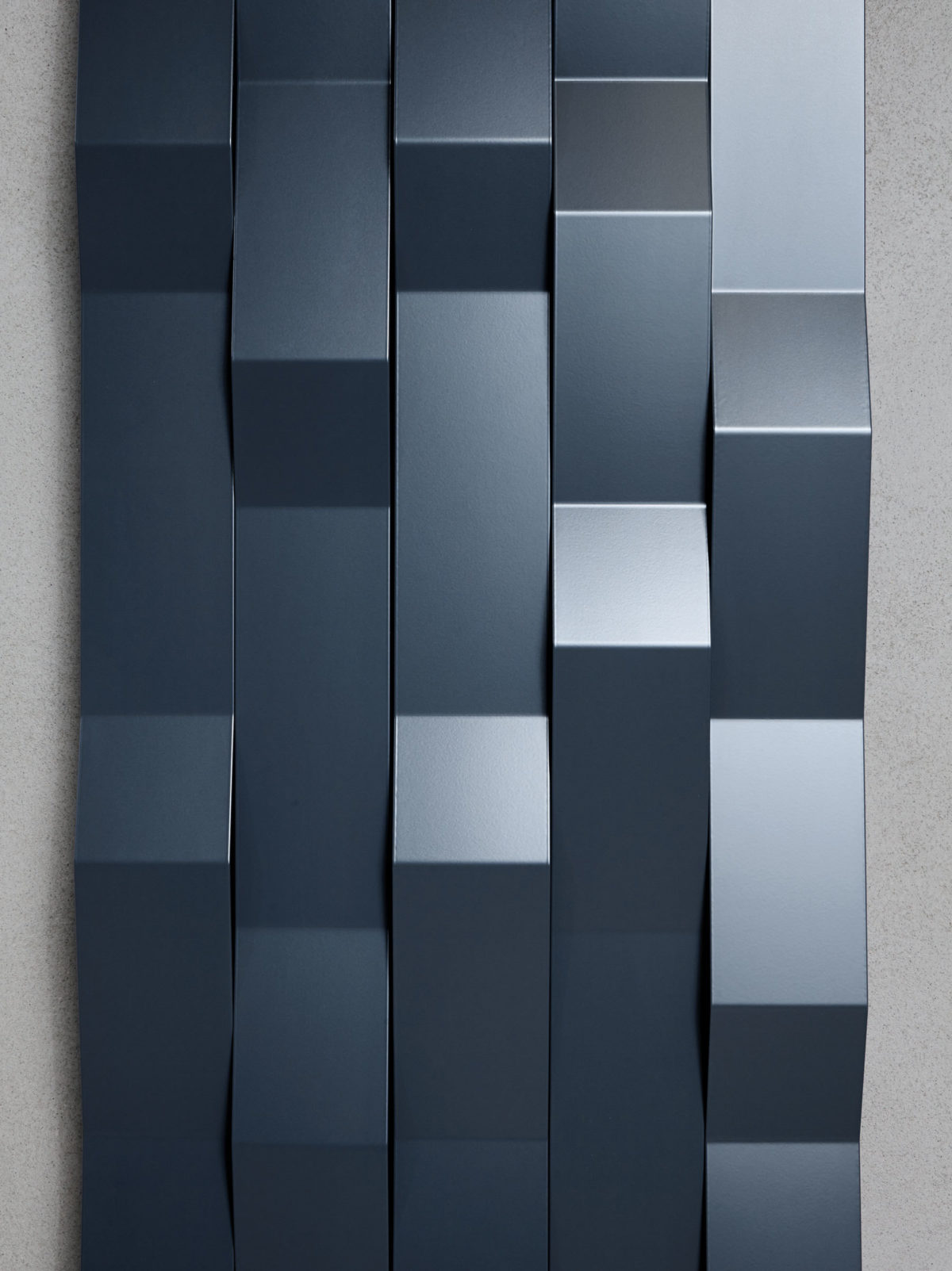 Šikmé talíře se střídají rytmicky tak, aby vytvářely nové hmotné pocity, které umožňují teplu najít svou přirozenou cestu.